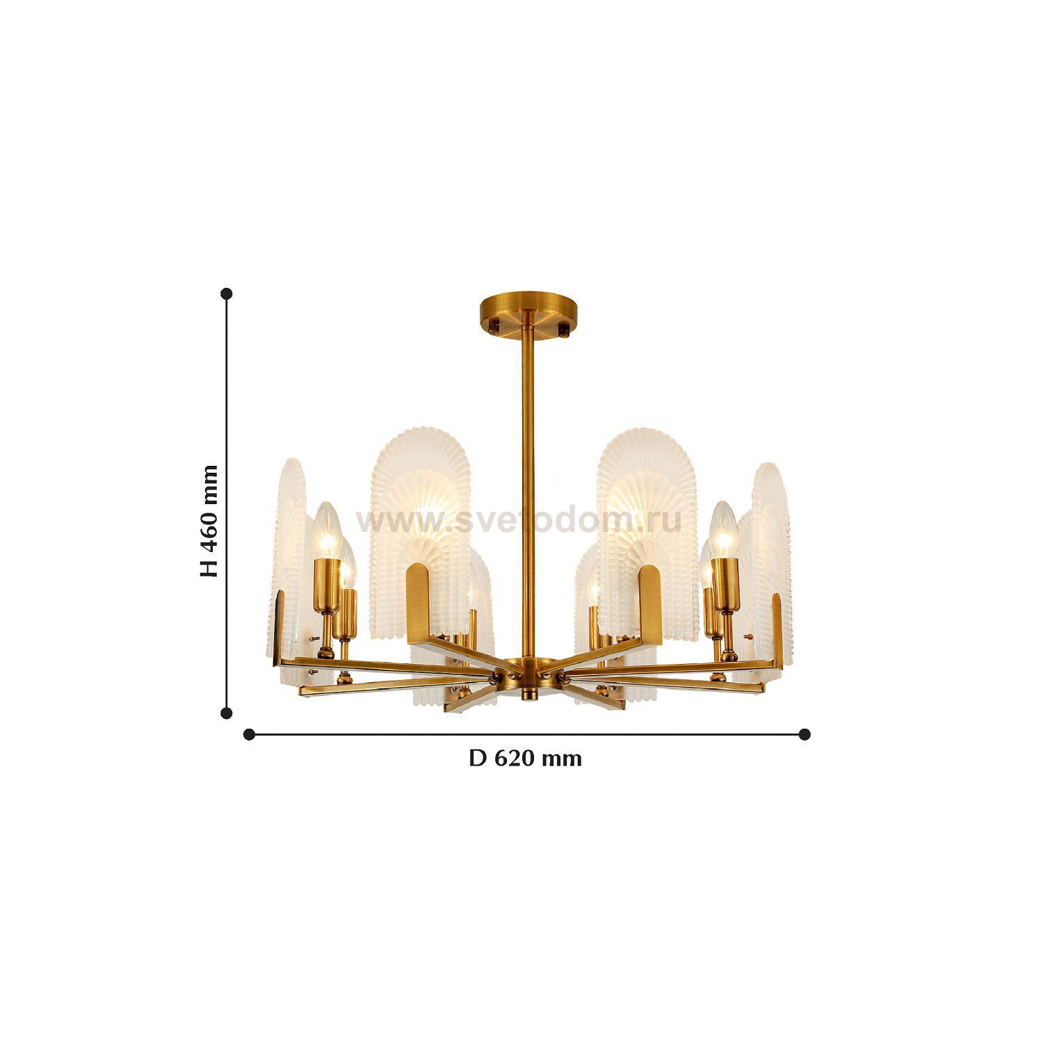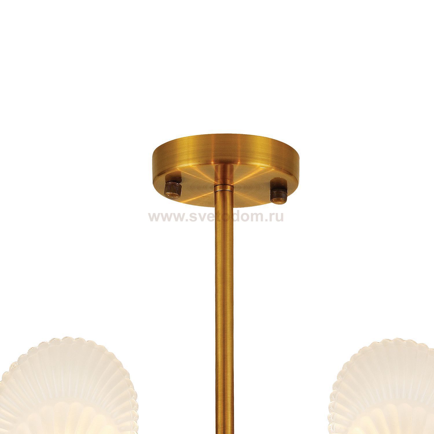каркас светильника покрыт гальваникой цвета латуни, стеклянные плафоны выполнены из узорного стекла, напоминающего многоярусные арки, матового цвета Штрих-код