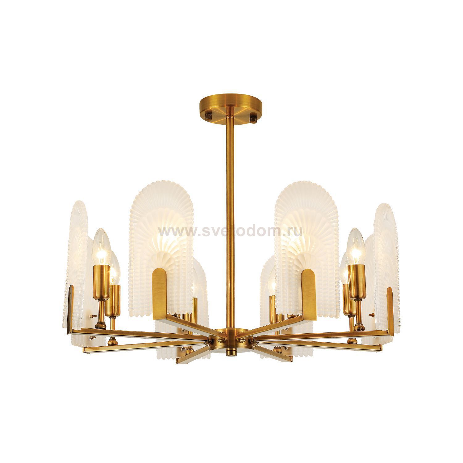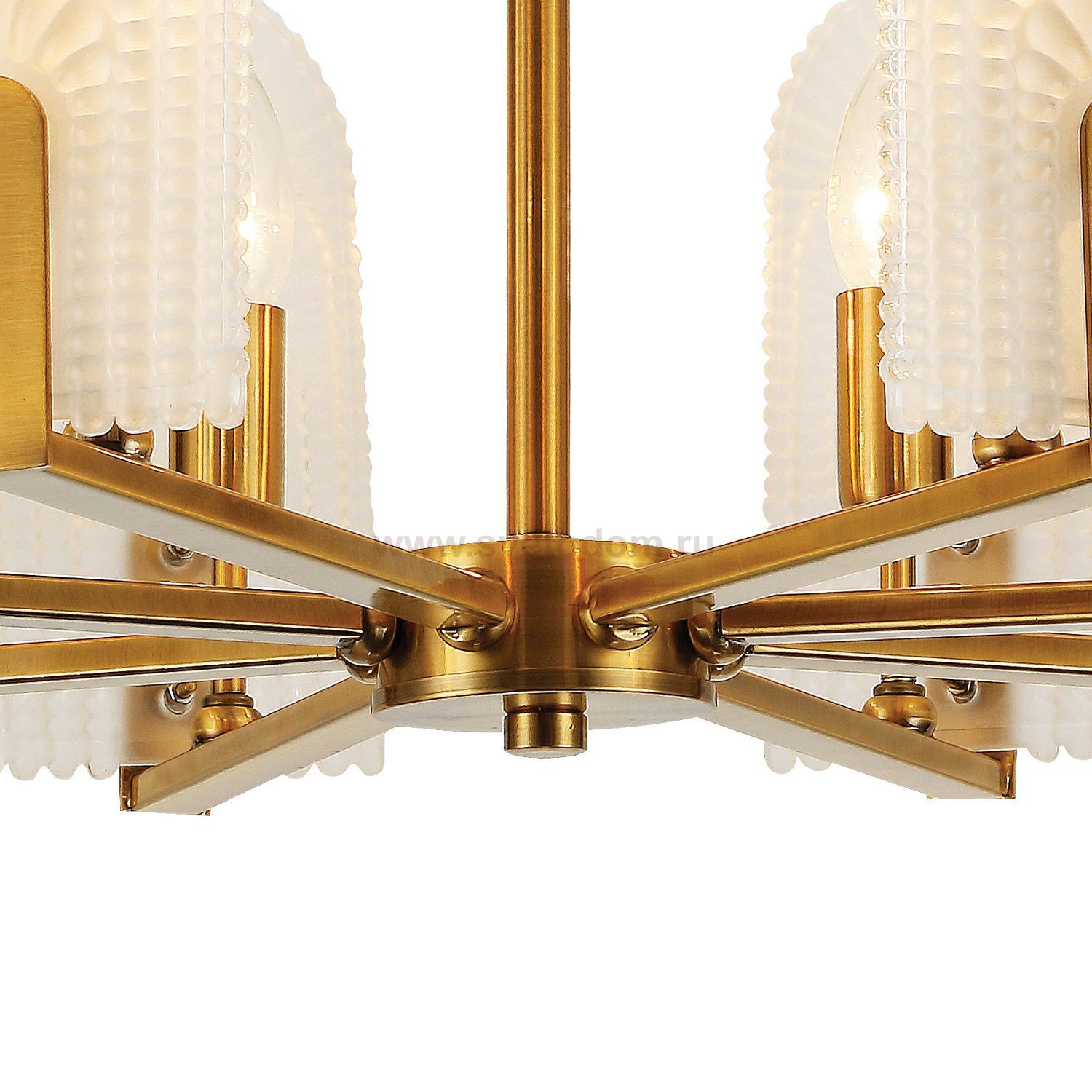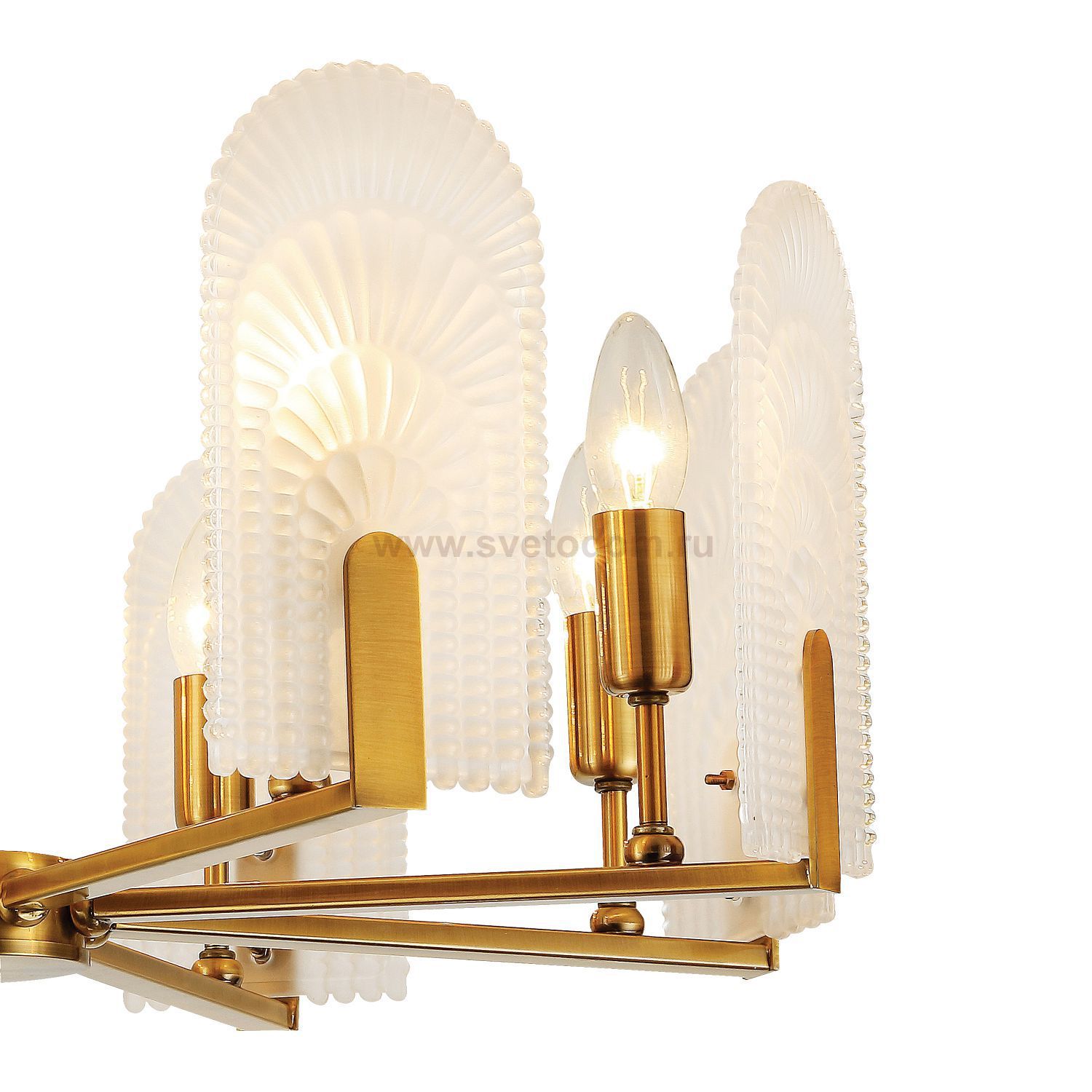 каркас светильника покрыт гальваникой цвета латуни, стеклянные плафоны выполнены из узорного стекла, напоминающего многоярусные арки матового цвета Материал плафона