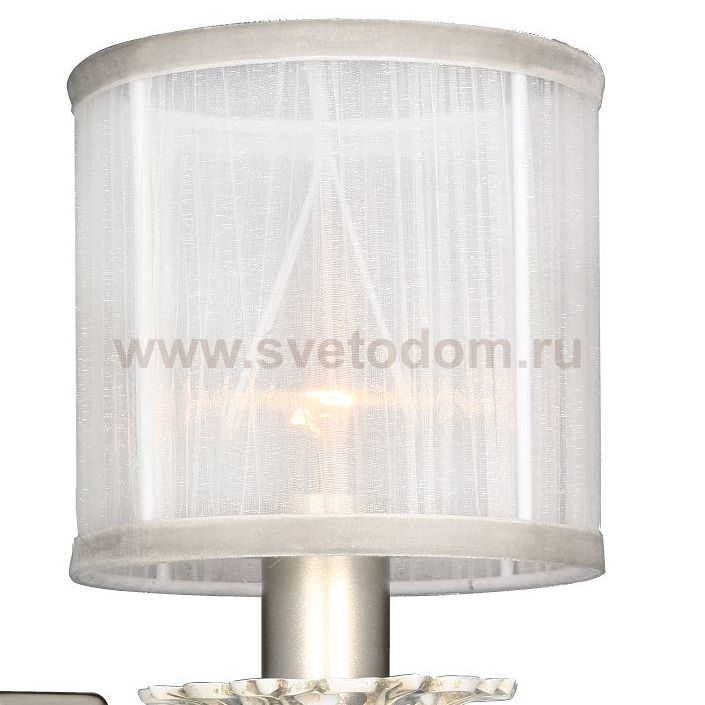 металлический каркас серебристого цвета с легким оттенком шампанского, декоративные элементы окрашены в белый цвет с серебристой патиной, абажуры из белой органзы Материал плафона