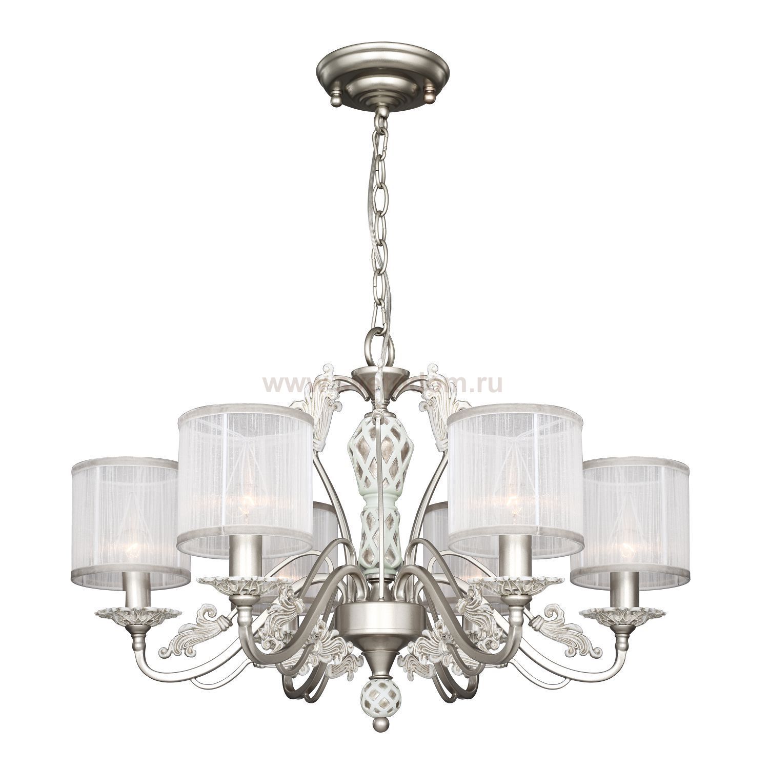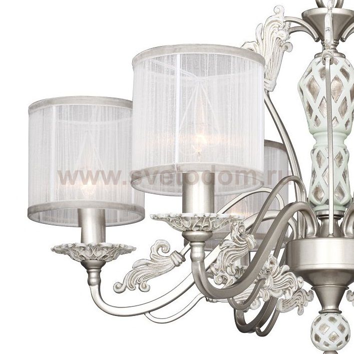 металлический каркас серебристого цвета с легким оттенком шампанского, декоративные элементы окрашены в белый цвет с серебристой патиной, абажуры из белой органзы Материал плафона