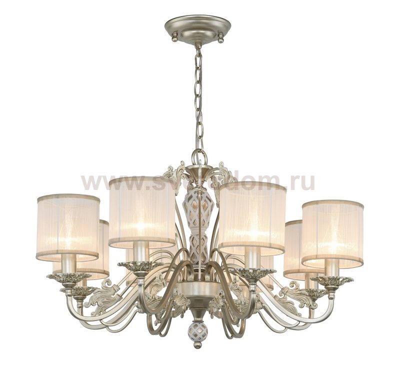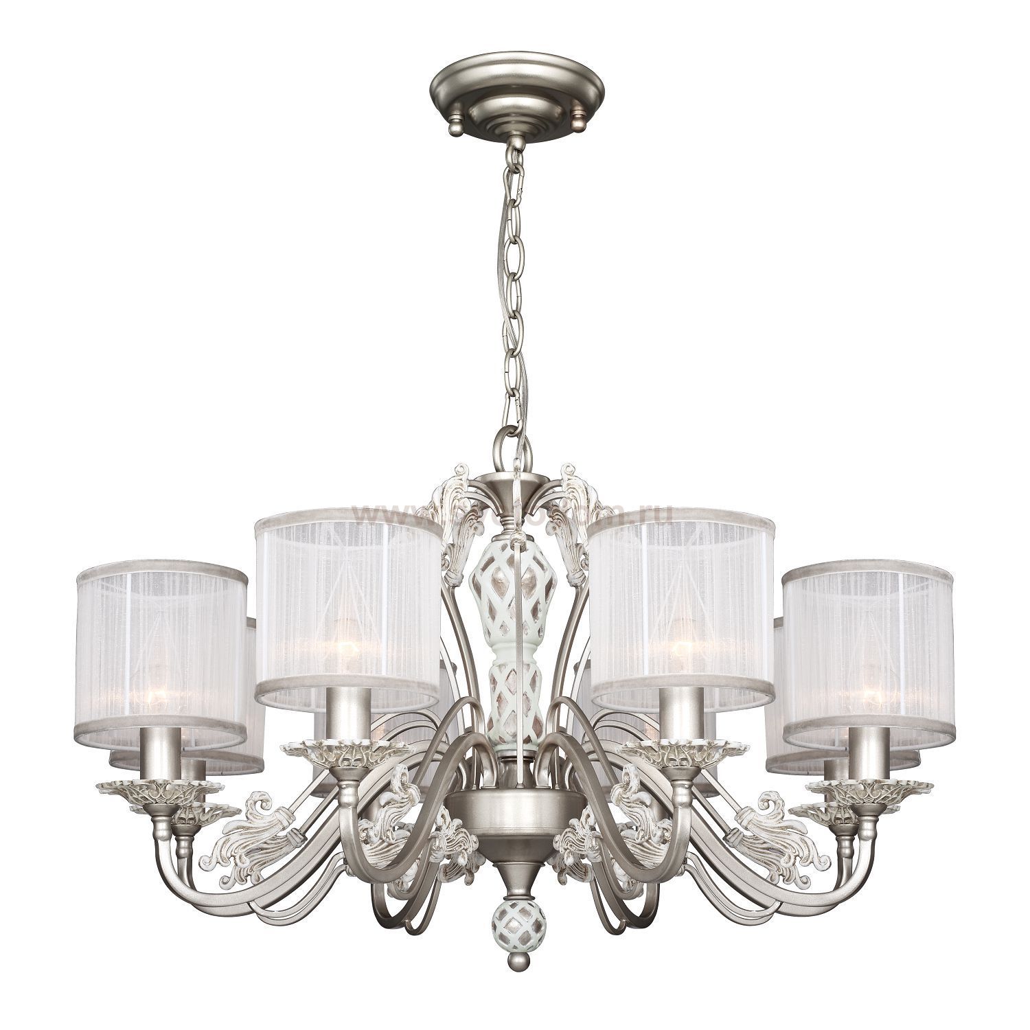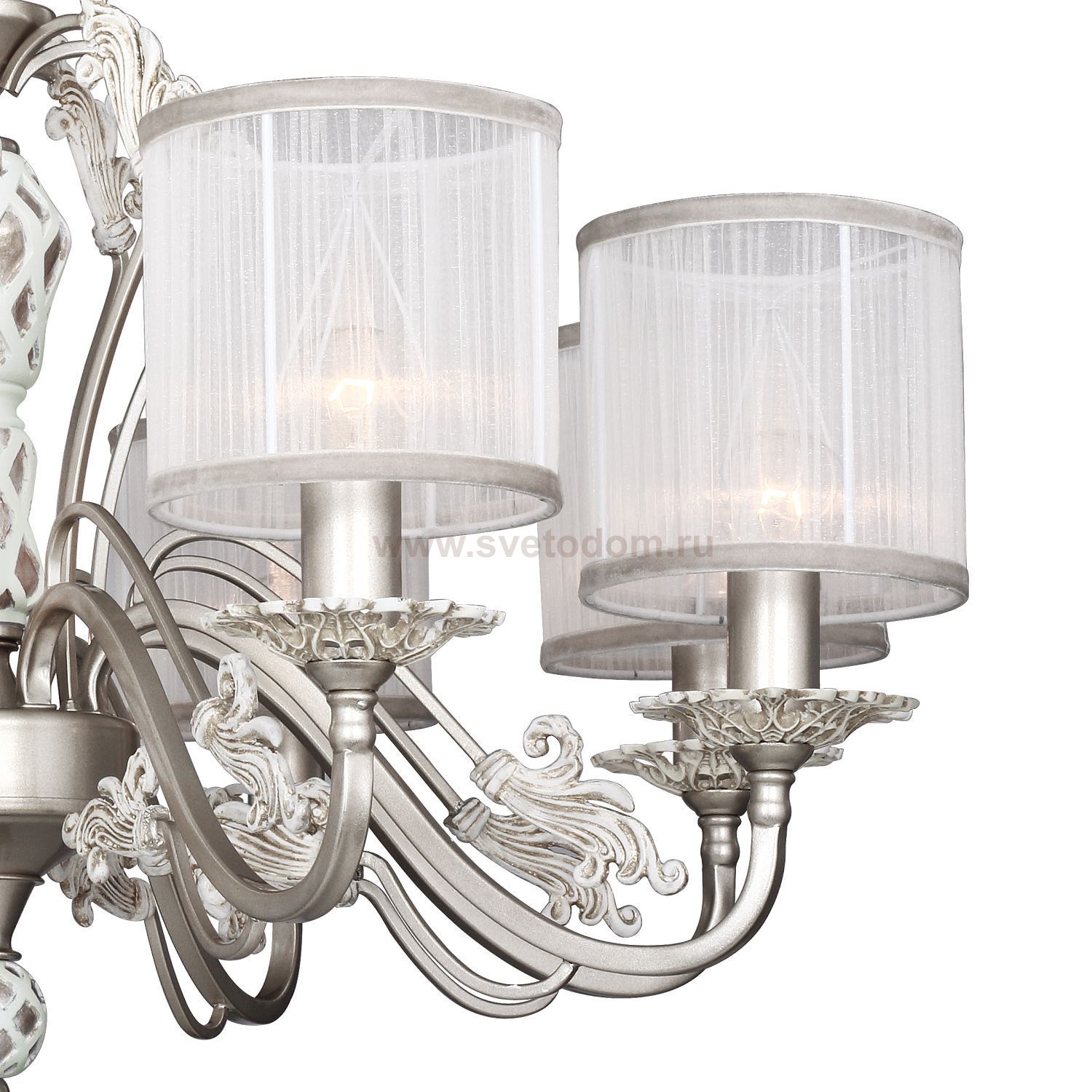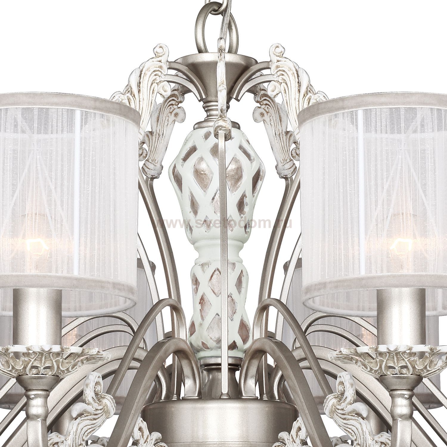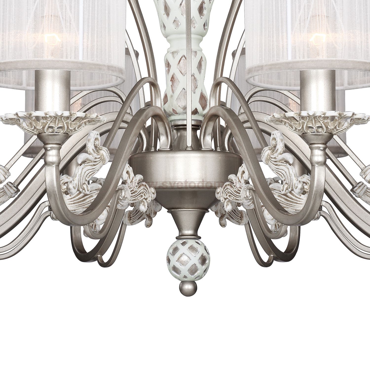 металлический каркас серебристого цвета с легким оттенком шампанского, декоративные элементы окрашены в белый цвет с серебристой патиной, абажуры из белой органзы Материал плафона