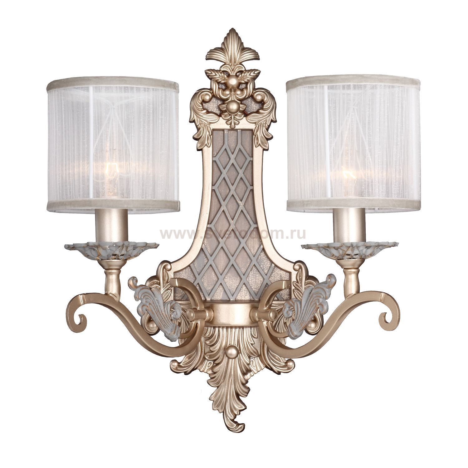 каркас светильника окрашен в золотистый цвет в сочетании с благородным серым с золотой патиной, тканевые абажуры из белой органзы. Штрих-код