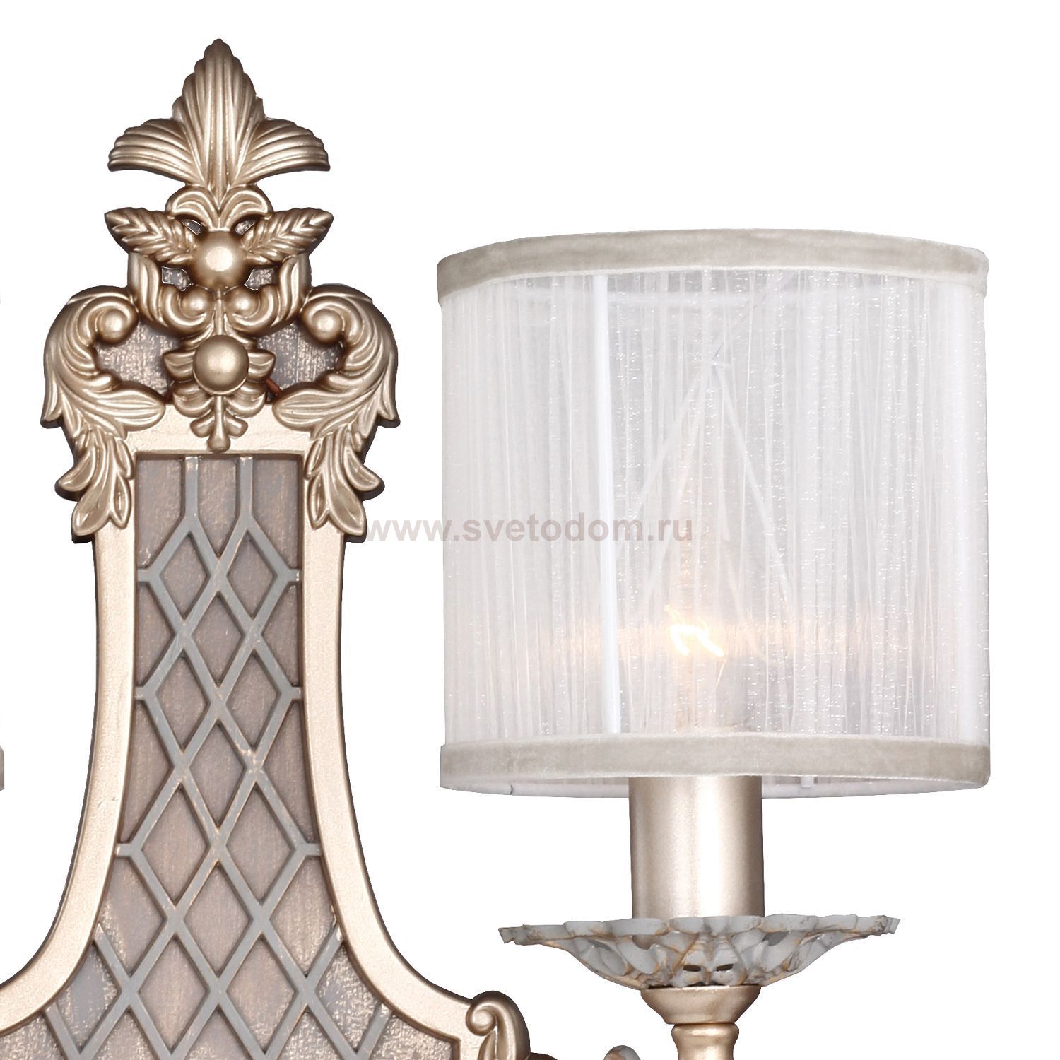 каркас светильника окрашен в золотистый цвет в сочетании с благородным серым с золотой патиной, тканевые абажуры из белой органзы Материал плафона