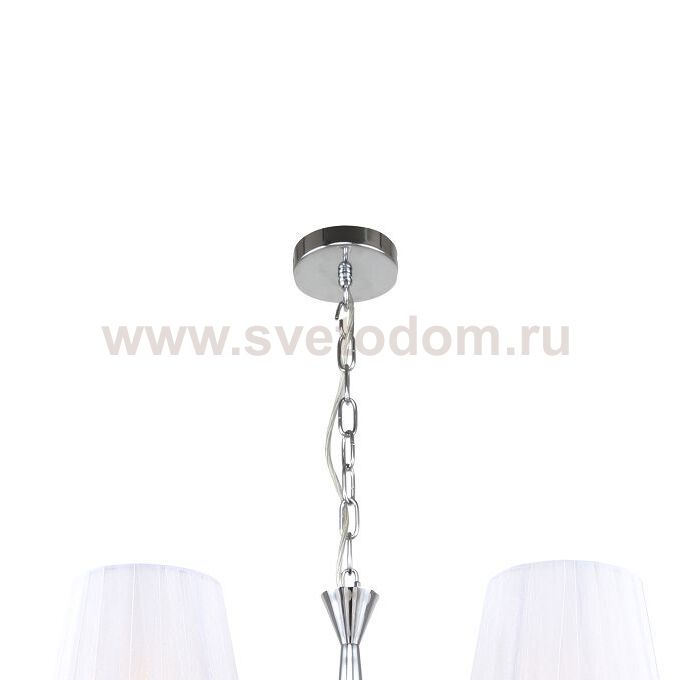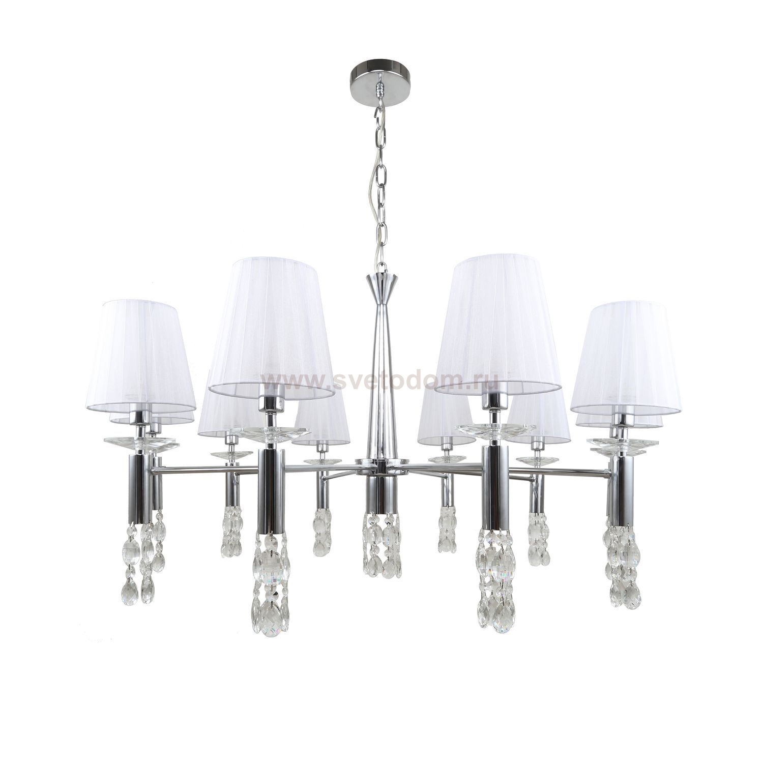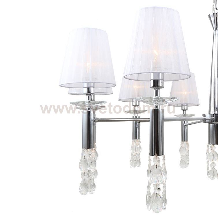 каркас цвета хром, абажуры из полупрозрачной серебристой ленты, хрусталь высшего качества, дополнительный источник света G9 в нижней части рожков Цвет декора