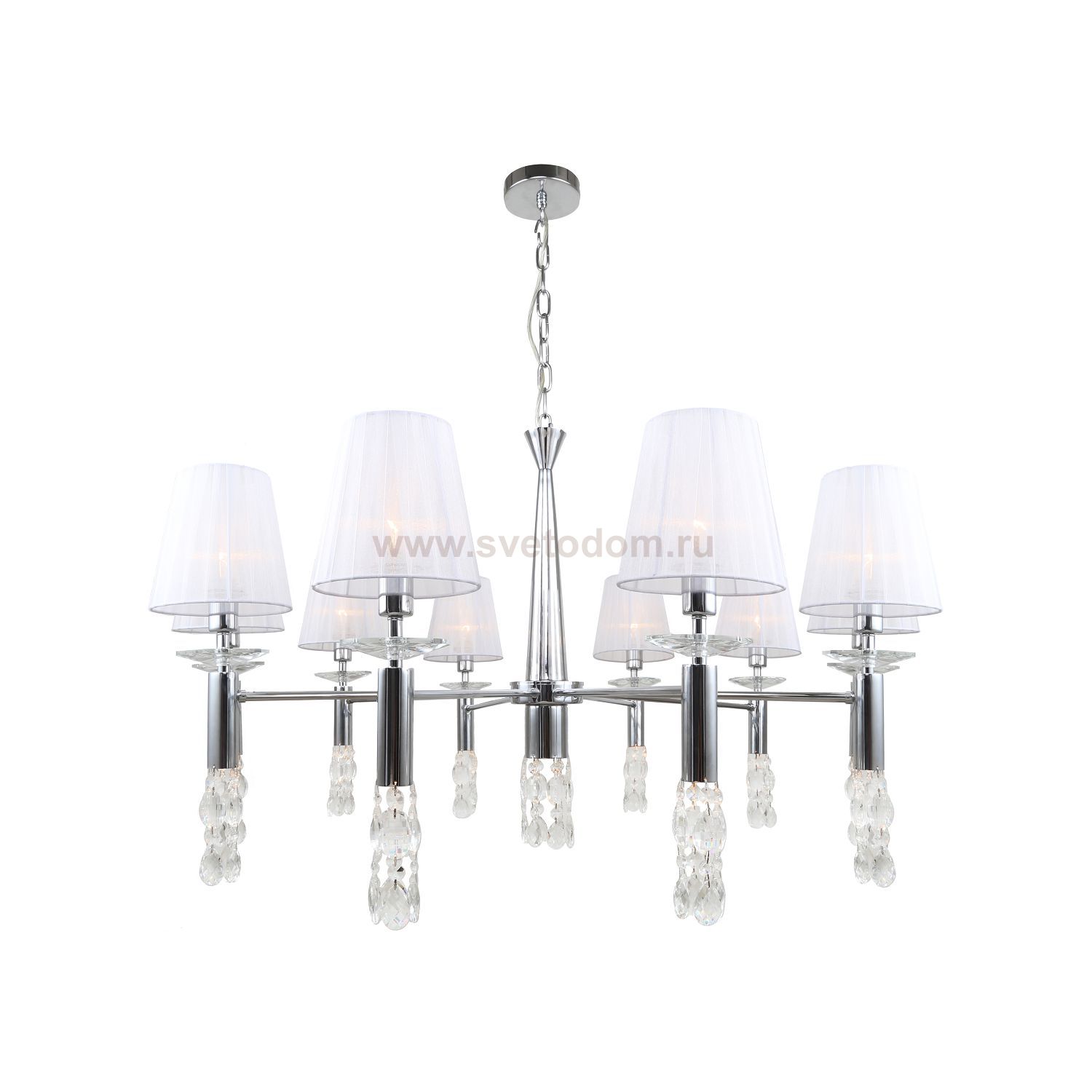 каркас цвета хром, абажуры из полупрозрачной серебристой ленты, хрусталь высшего качества, дополнительный источник света G9 в нижней части рожков Серия