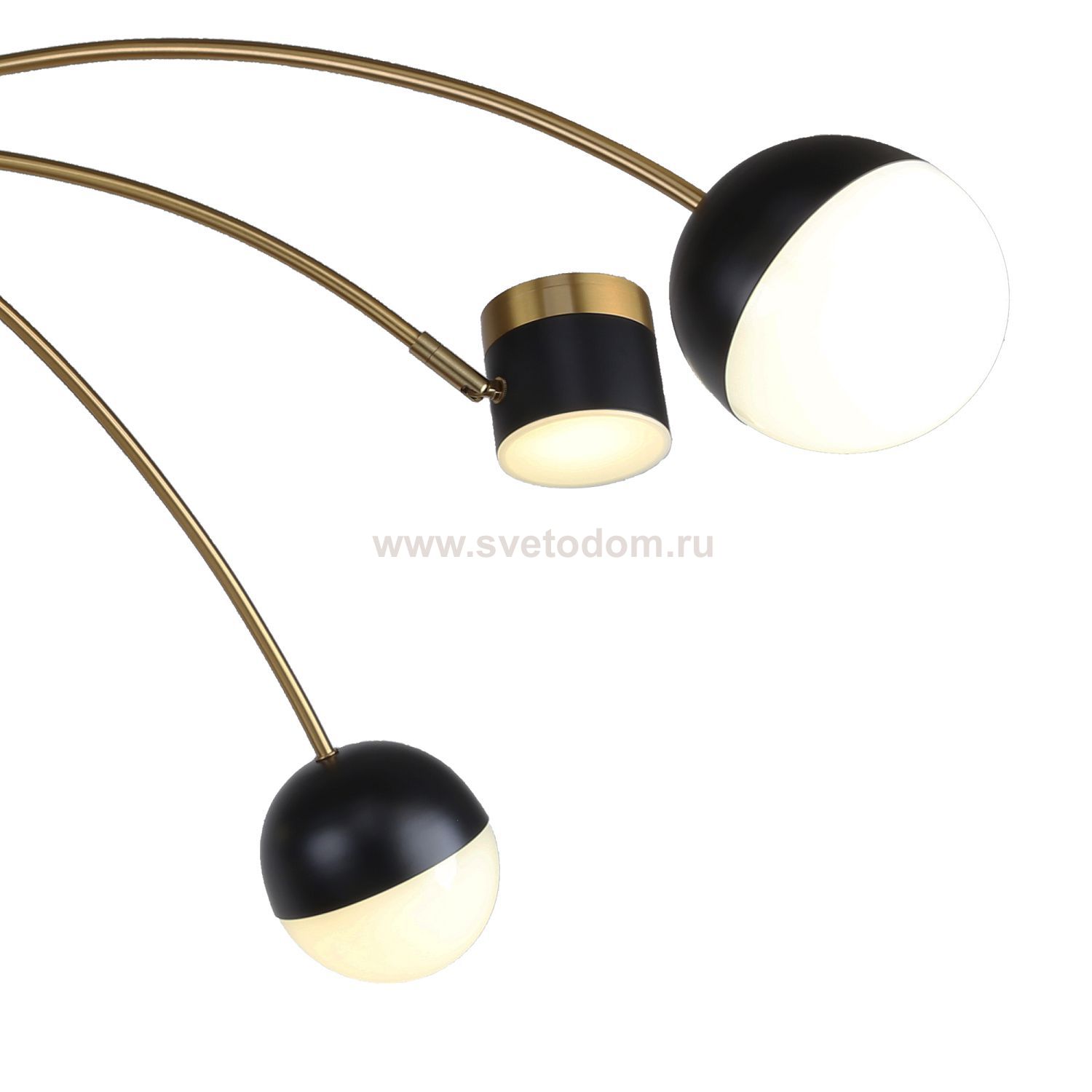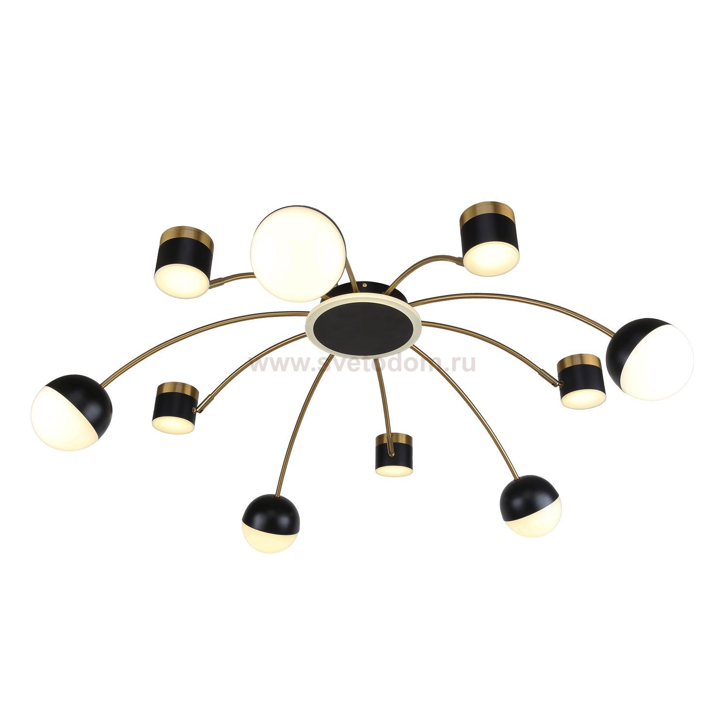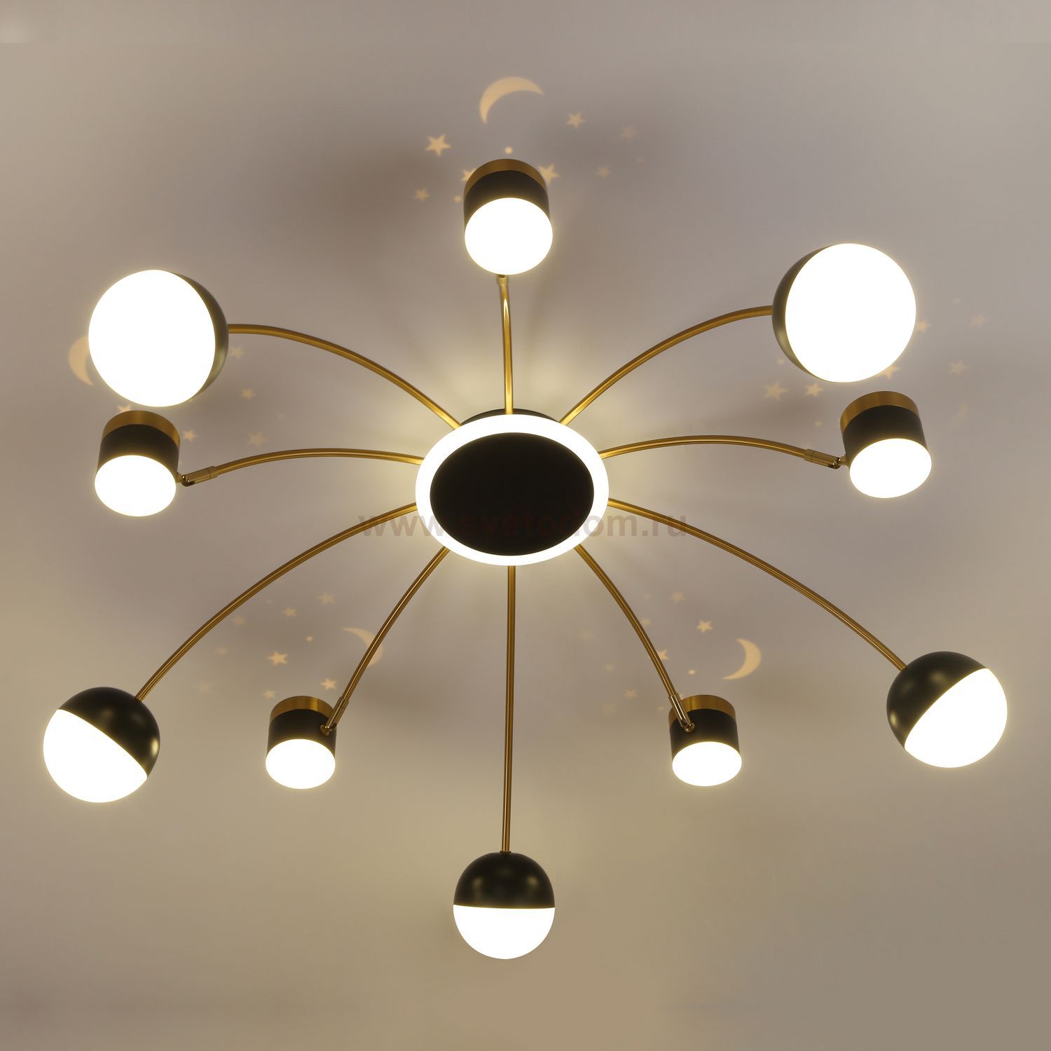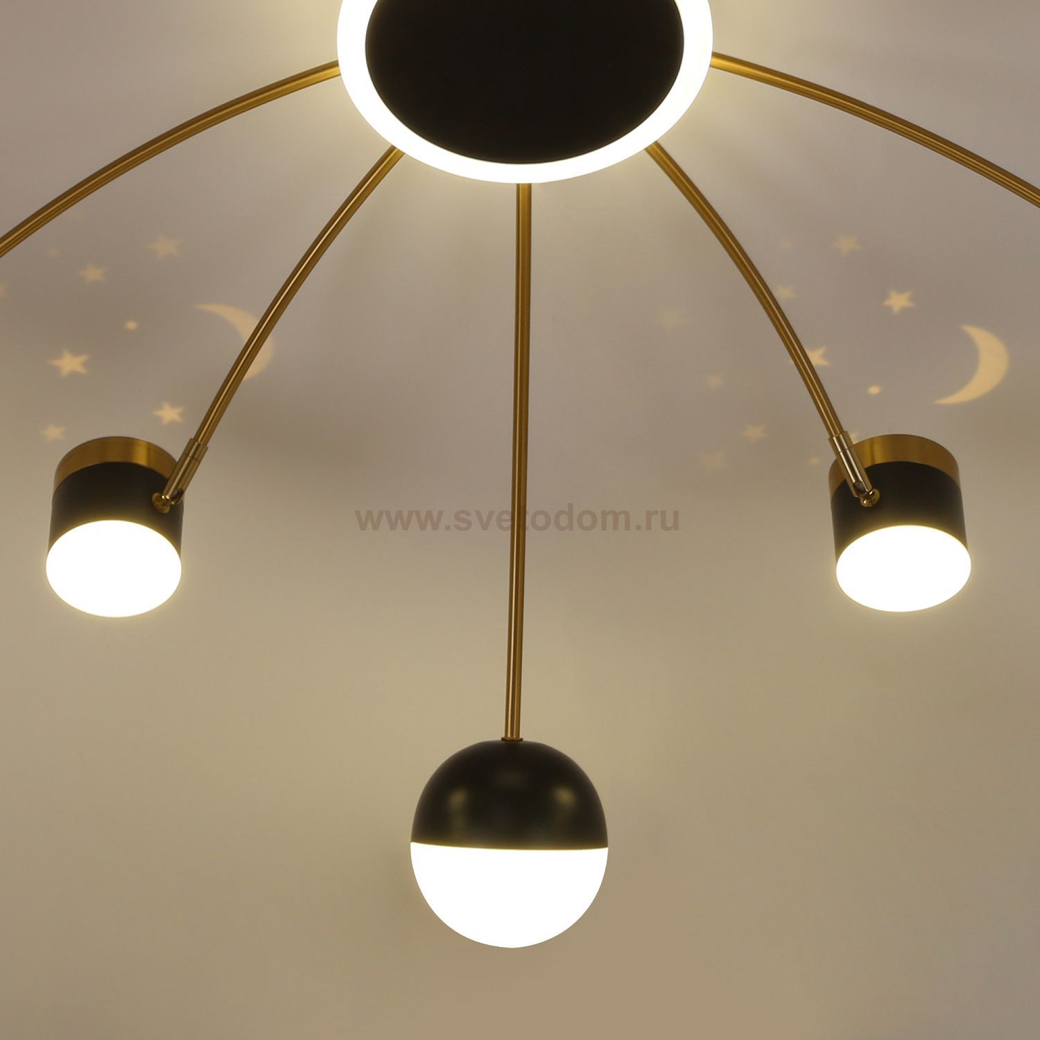 каркас светильника сочетает два цвета - черный и латунь, плафоны разных форм и размеров из белого акрила. Световый эффект - отражение луны и звезд на Цвет декора