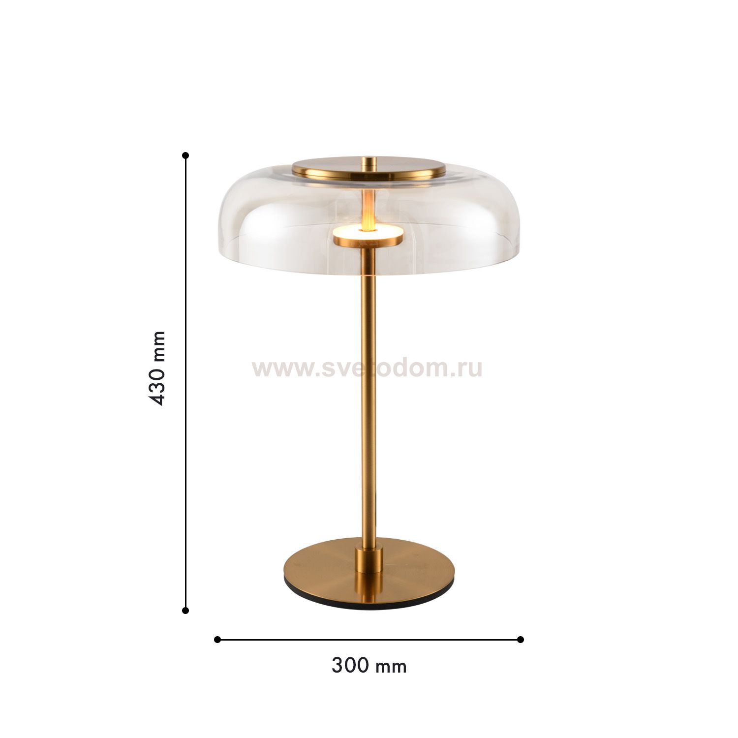 Настольная лампа с латунным каркасом, с выдувным плафоном из прозрачного стекла, внутри которого находится светящийся элемент с модулем LED. Серия