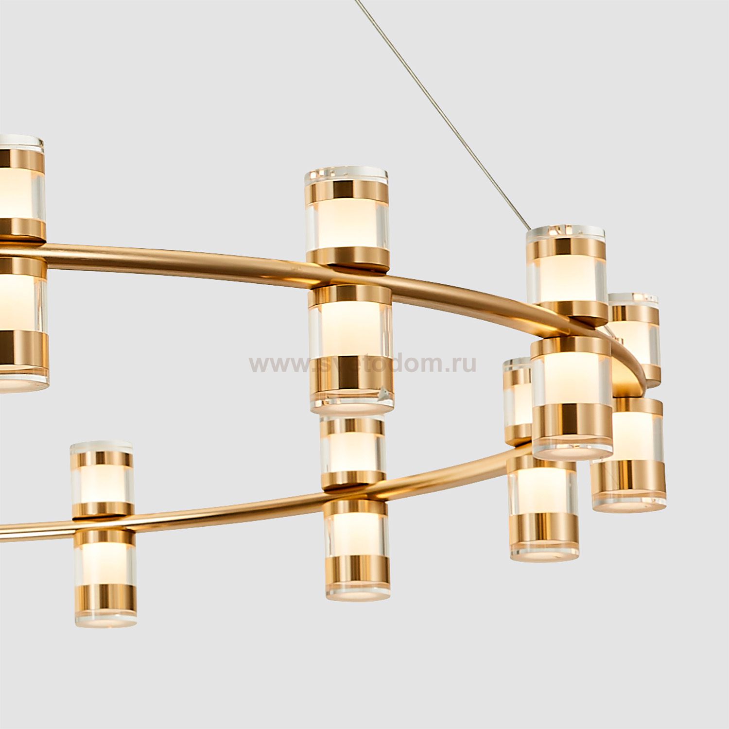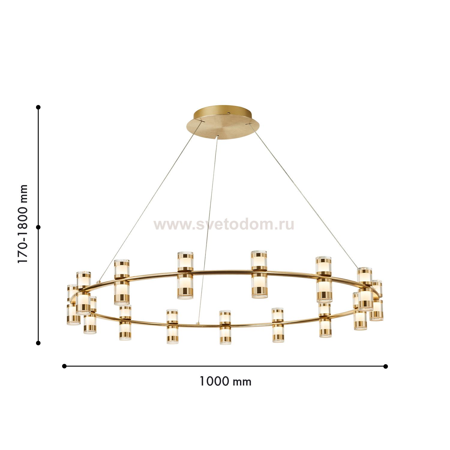 Подвесная люстра в золотом цвете, диаметром 100 см оснащена двусторонним многослойным стеклянным плафоном с светящимся цилиндром внутри и золотыми дек Декор