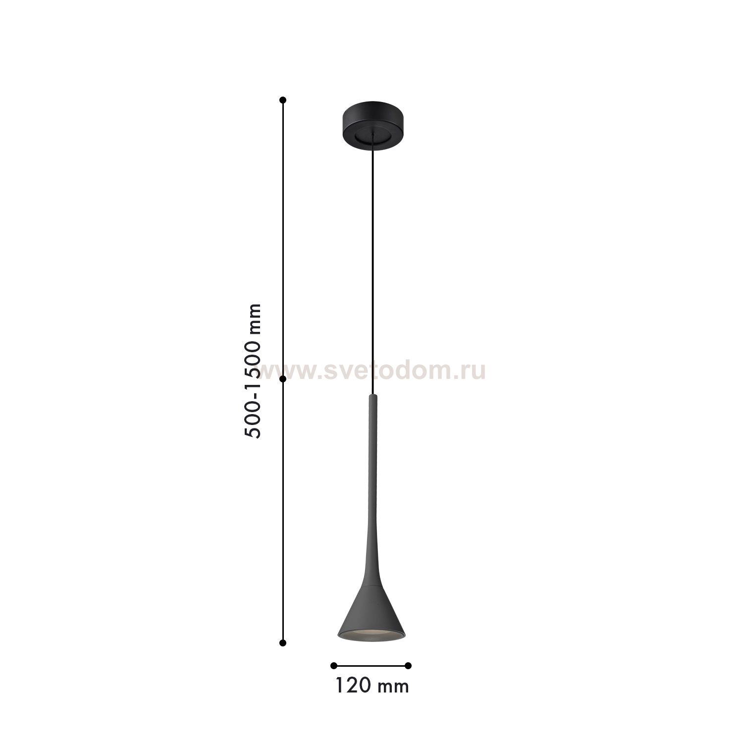 Подвес с черным каркасом, плафон из алюминия в форме тонкого удлиненного цилиндра с конусом на конце в черном цвете, в нижней части подвеса расположен Серия