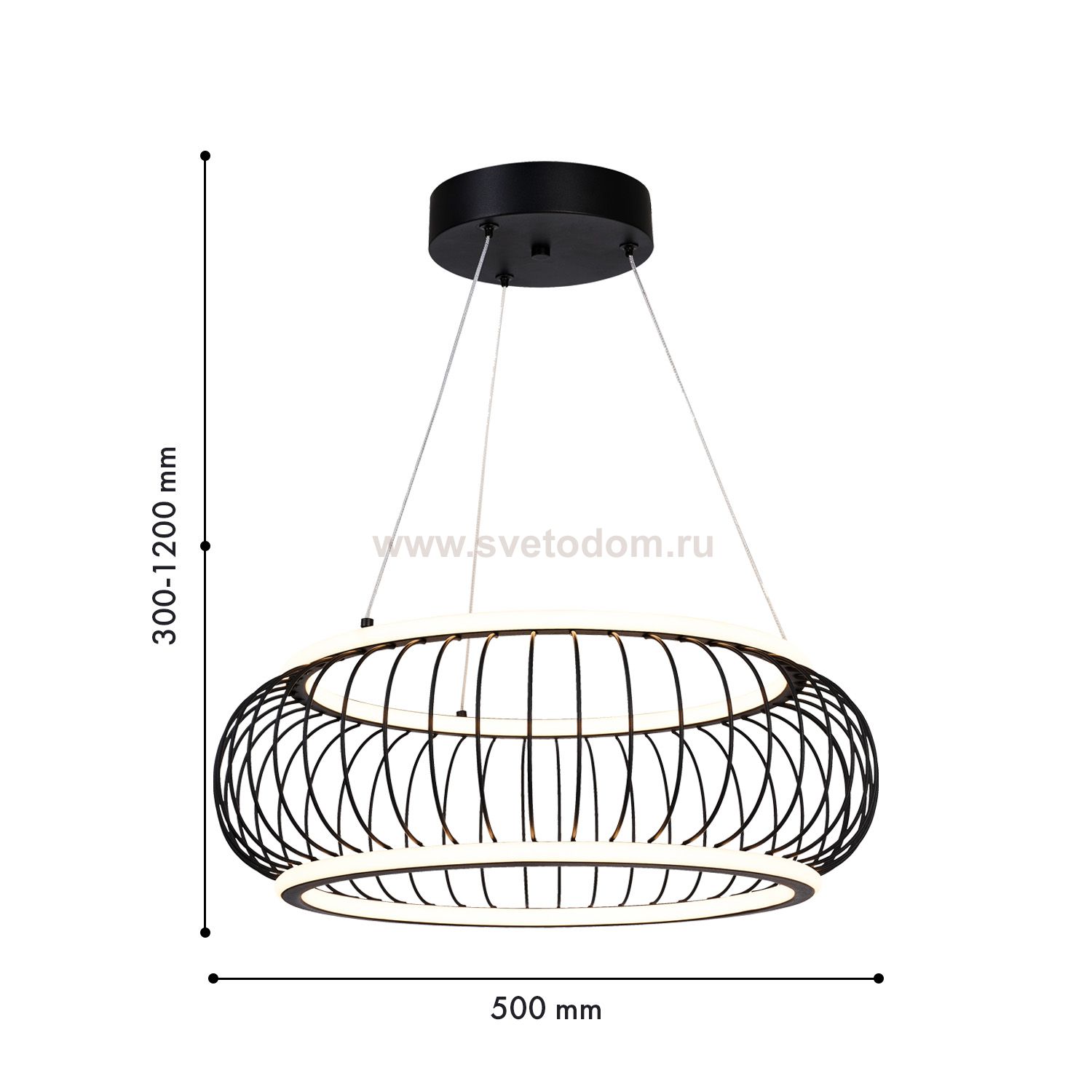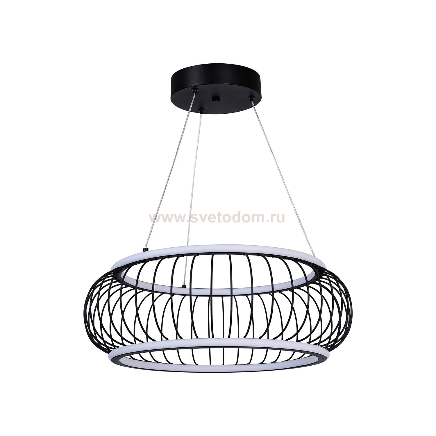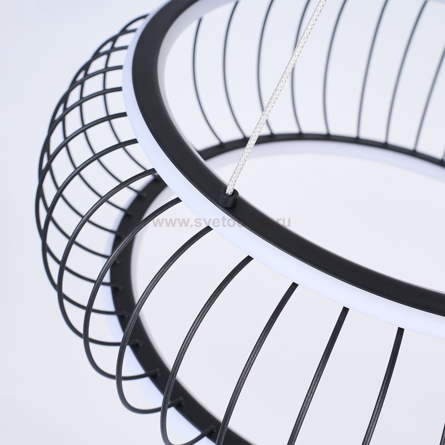 Округлое верхнее и нижнее основание черного цвета, LED-лента, регулируется пультом управления. Плафон - решетка из черных матовых металлических прутик Серия