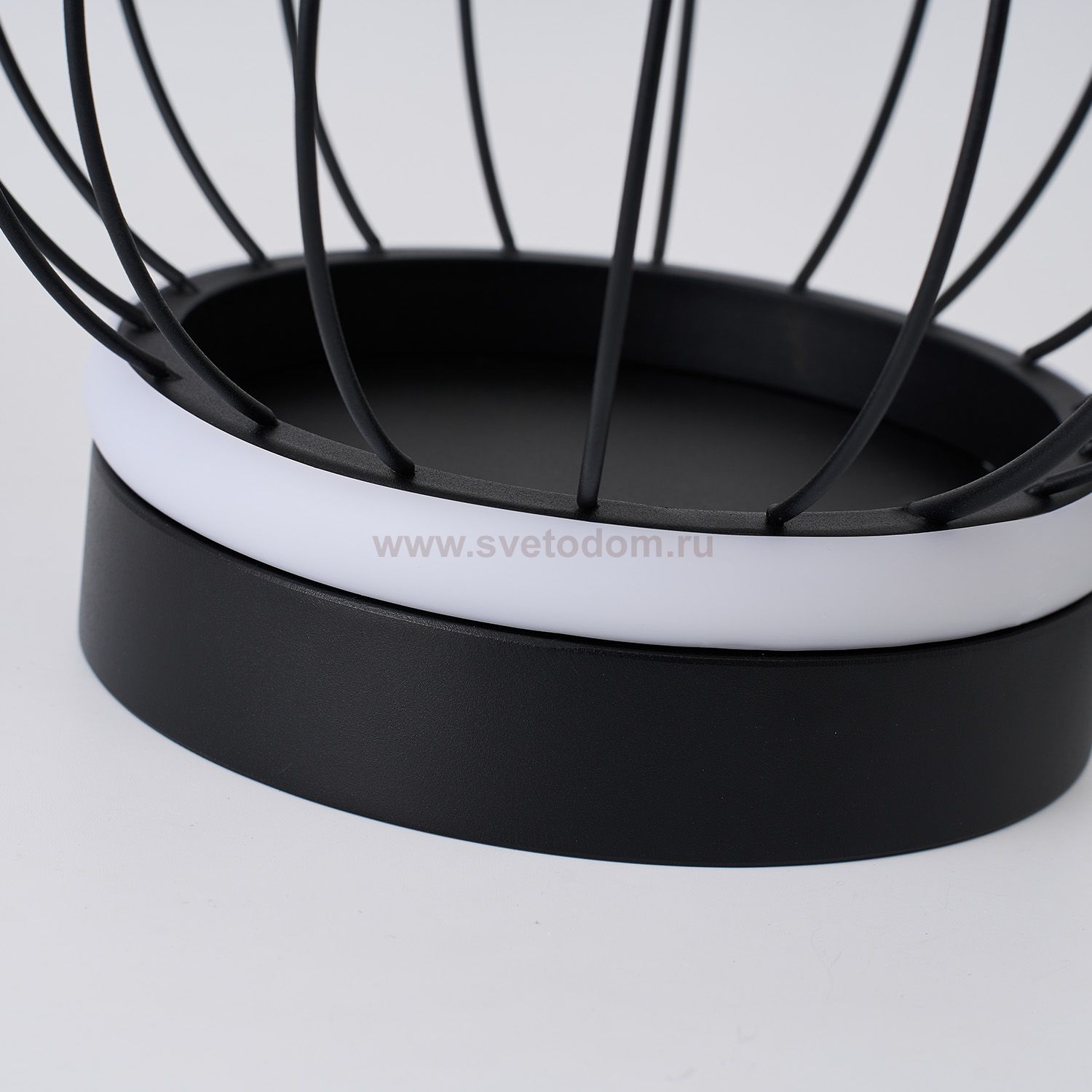 Округлое верхнее и нижнее основание черного цвета, LED-лента, регулируется пультом управления. Плафон - решетка из черных матовых металлических прутик Серия