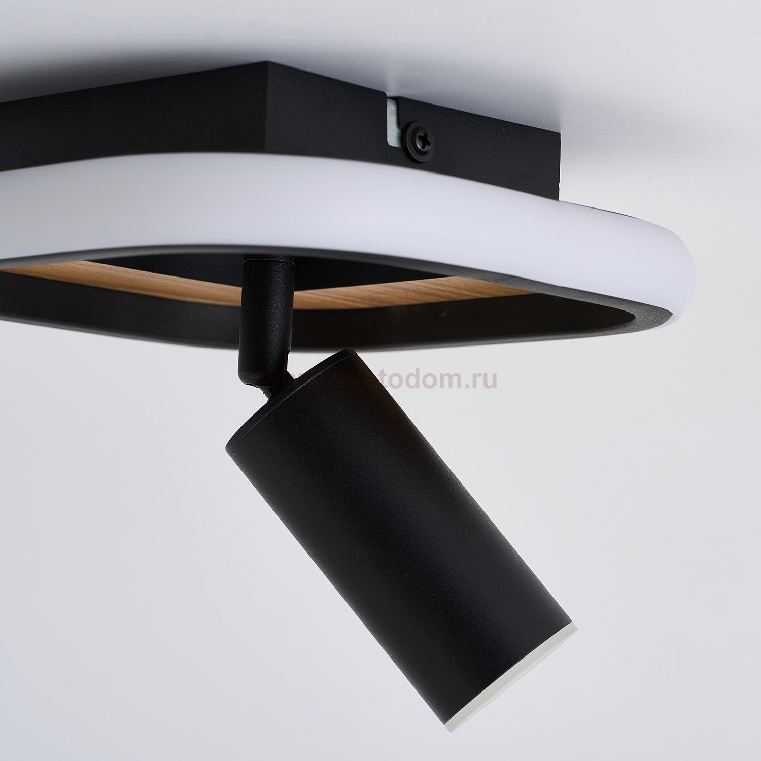 Декоративная вставка из МДФ с фактурой дерева на основании светильника, матовый черный каркас, LED-модуль, поворотные споты. Серия