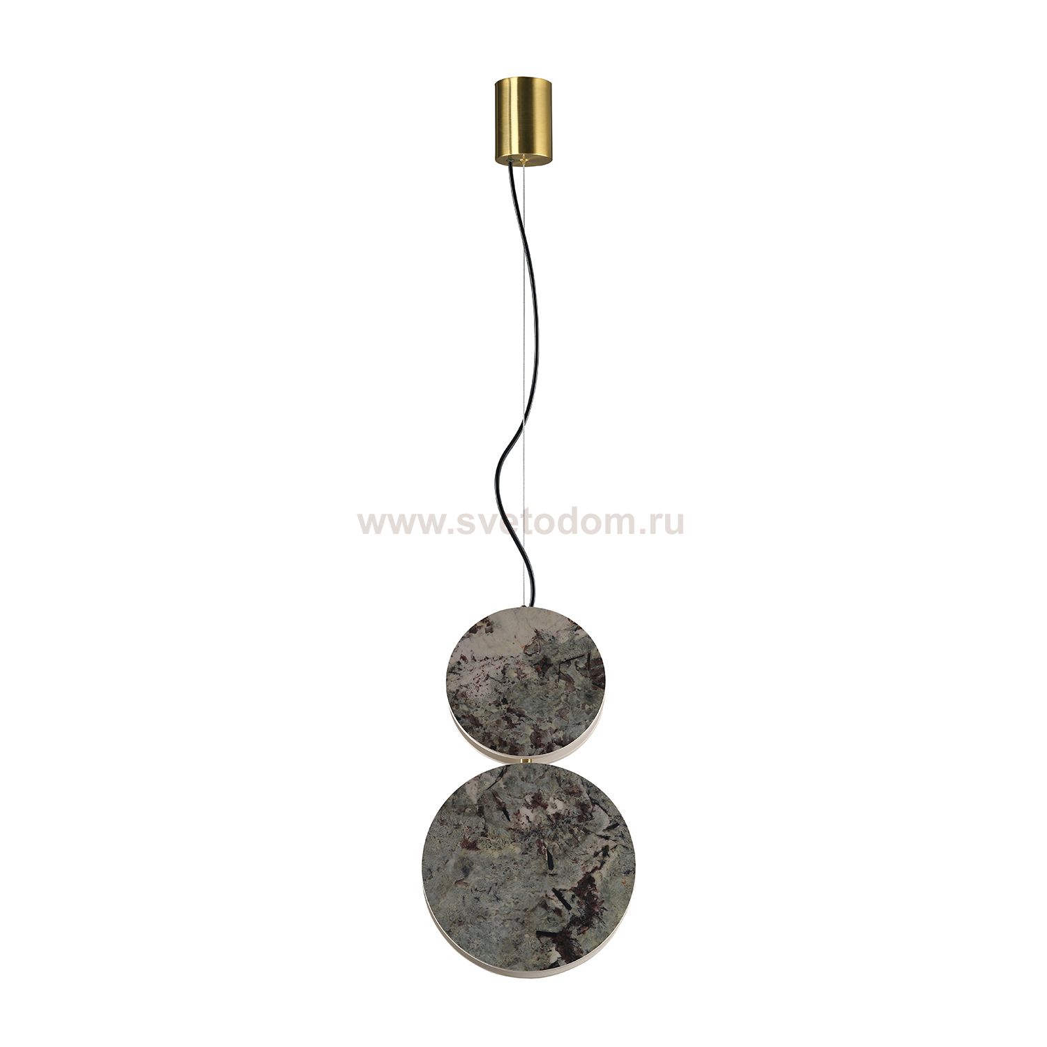Плафоны из искусственного мрамора серо-зеленого оттенка в форме диска, светящегося по контуру, чаша крепления золотого цвета. Декор
