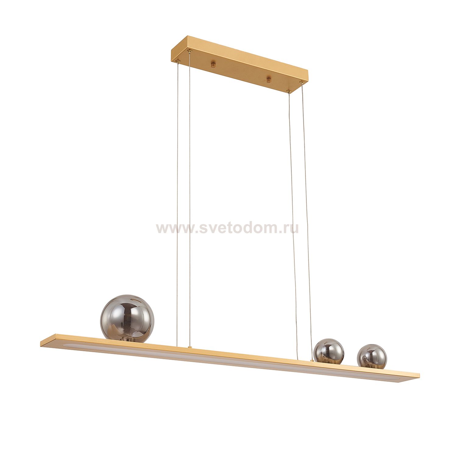 Подвес удлиненной прямоугольной формы в цвете золото. Основным источник света LED направлен вниз, декоративные зеркальные серые плафоны, ассиметрично Декор