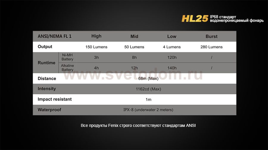В конструкции модели Fenix HL25 разработчики постарались учесть все требования к качественному налобному фонарю. В стандартный комплект входит удобный эластичный ремешок на голову, который освобождает руки пользователя. В систему фонаря интегрирован светодиод Cree XP-G2 (R5) с эксплуатационным запасом 50 000 часов. Его максимальная мощность достигает 280 люмен в режиме Burst. Но помимо этого значения доступны еще 3 ступени яркости(High -150 люмен; Mid -50 люмен; Low - 4 люмена). Для управления работой фонаря предназначена кнопка в боковой части корпуса. Переключение происходит в порядке High-Low-Mid. Но в модели Fenix HL25 предусмотрен интеллектуальный механизм запоминания последнего выбранного режима. Также в фонаре задействована цифровая система стабилизации яркости, защита от переполюсовки элементов питания. А чтобы каждый пользователь мог самостоятельно установить оптимальное направление луча света, использован поворотный механизм, регулирующий угол наклона корпуса фонаря в рамках 60°. Батарейный блок Fenix HL25 рассчитан на 3 элемента питания формата ААА. Это могут быть щелочные батарейки или же Ni-MH аккумуляторы. Корпус данной модели осветительного устройства выполнен из традиционного для компании Fenix материала — авиационного алюминия с анодированным покрытием высшей степени жесткости Premium Type III. Он стойкий к механическим повреждениям, коррозии и полностью защищен от попадания внутрь воды. Фонарь можно использовать не только под дождем, но даже под водой (30 мин работы на глубине до 2 м). Особенности: диод Cree XP-G2 (R5) с рабочим запасом 50 000 часов; 4 уровня яркости; мощность светового потока до 280 люмен; водонепроницаемость по стандарту IP6-8; прочный металлический корпус; дальность луча 68 м; управление одной боковой кнопкой. |