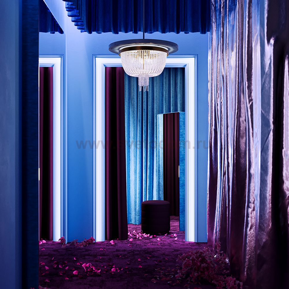 Материал абажура — хрустальное стекло, цвет — прозрачный. Металлическая арматура в цвете латунь. Потолочный светильник не регулируется по высоте. Источник света — лампы с цоколем Е14. Степень защиты — IP20.