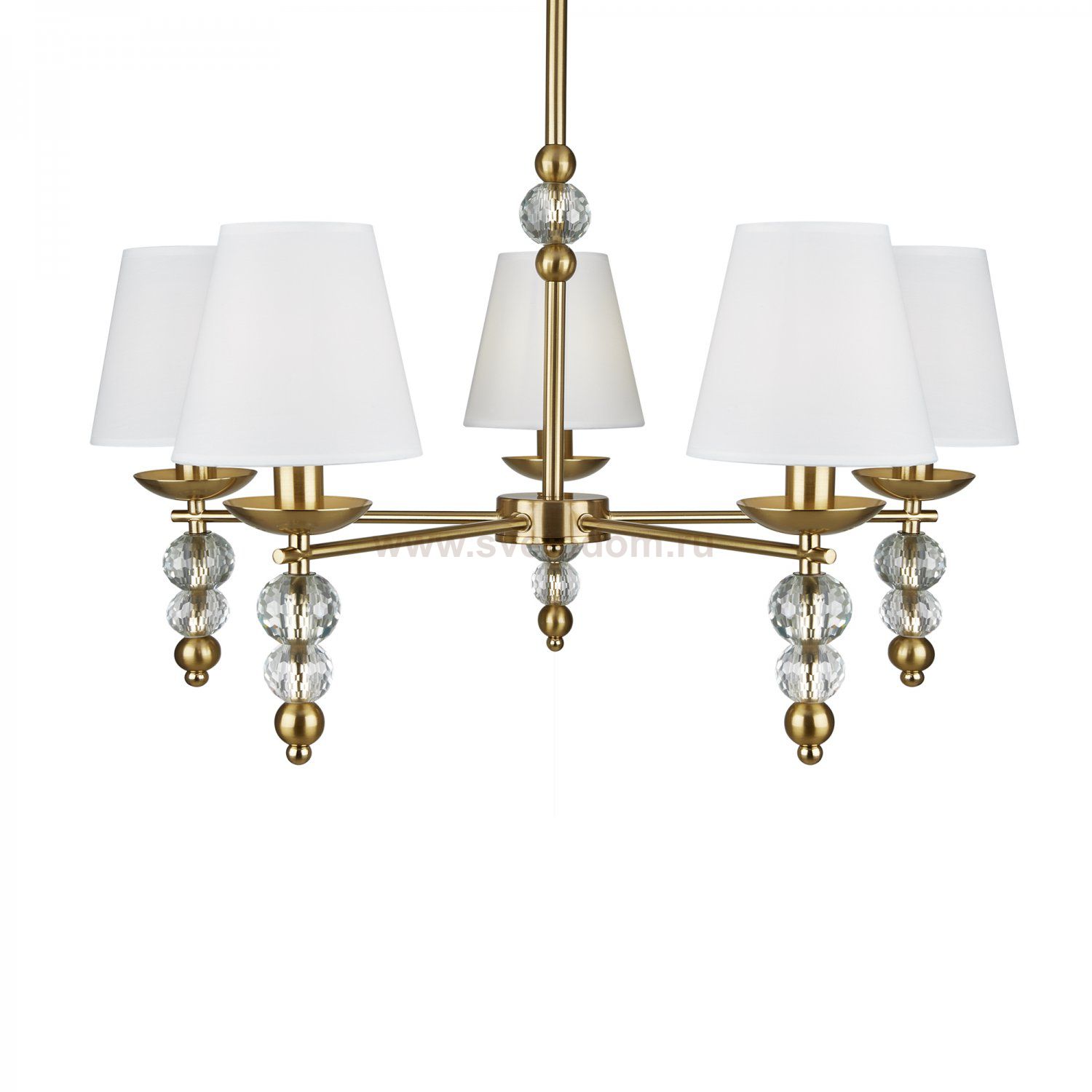 Материал абажура — ткань, цвет — белый. Металлическая арматура в цвете латунь обрамлена хрустальными бусинами. Источник света — лампы с цоколем Е14. Степень защиты — IP20.