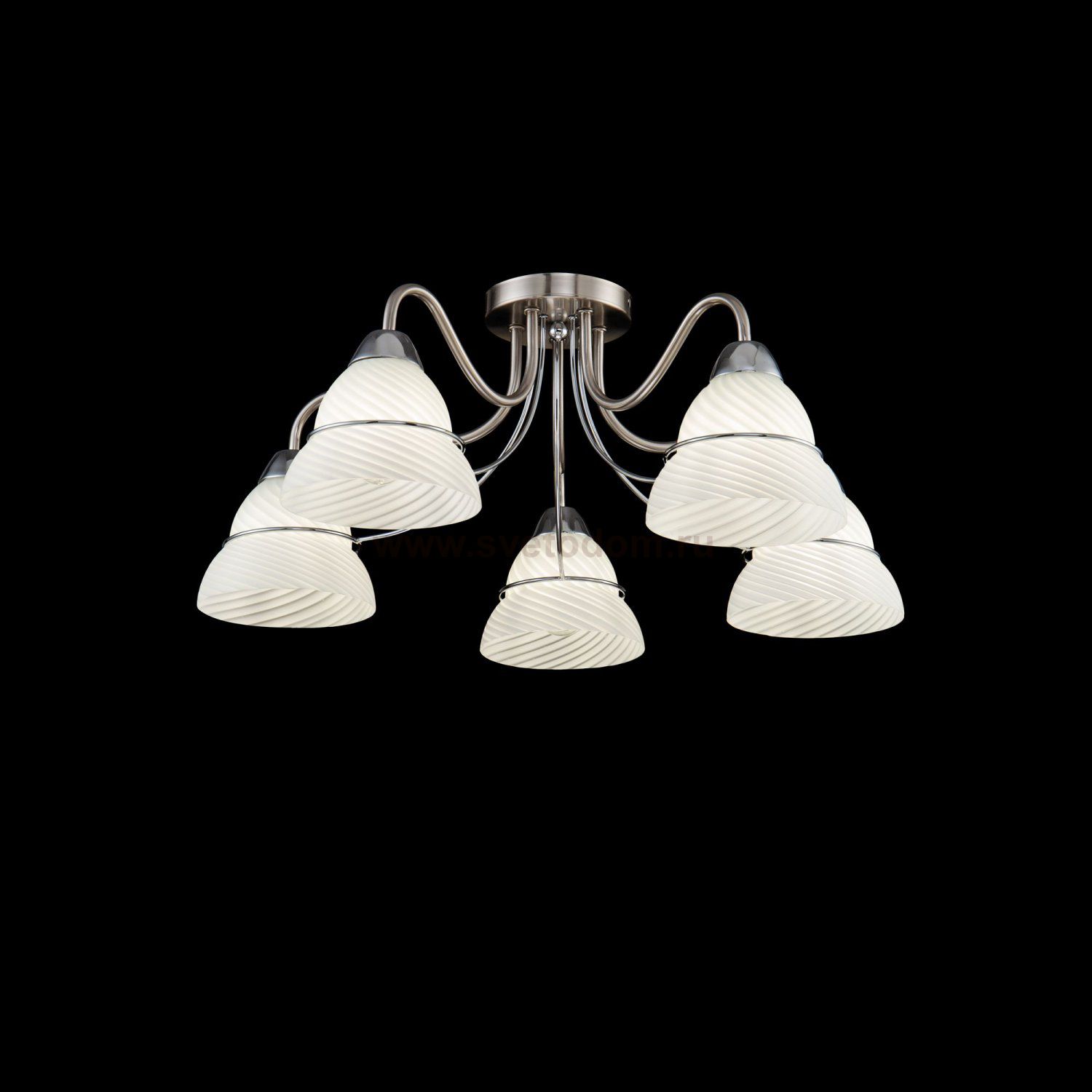 Серия светильников в современном стиле. Арматура сделана из металла, а плафоны - из белого матового стекла со спиральным рельефом. Каждый плафон украшен металлической полоской в тон арматуры.
