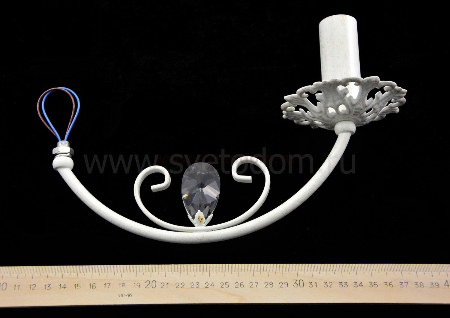 Люстра украшена круглым прозрачным граненым кристаллом, а рожки декорированы кристаллами. Основание люстры и декоративная чаша крепления рожков дополнены патинированным орнаментом. Белоснежные абажуры украшены золотой тесьмой.