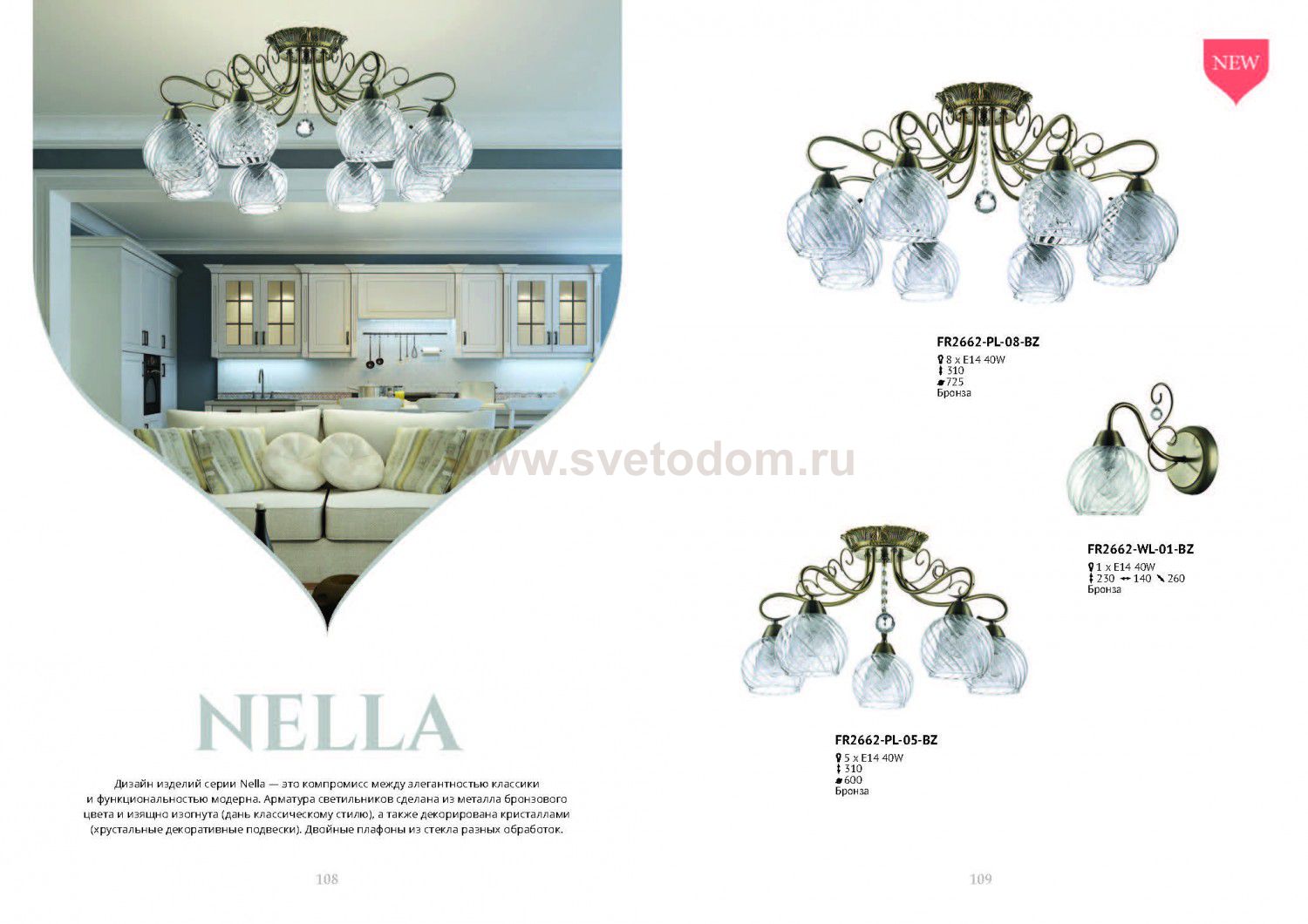 Дизайн изделий серии Nella – это компромисс между изяществом и строгостью классики с функциональностью и лаконичностью модерна. Арматура светильников сделана из металла бронзового цвета и причудливо изогнута (дань классическому стилю), а также декорирована кристаллами. Двойные плафоны из стекла разных обработок.