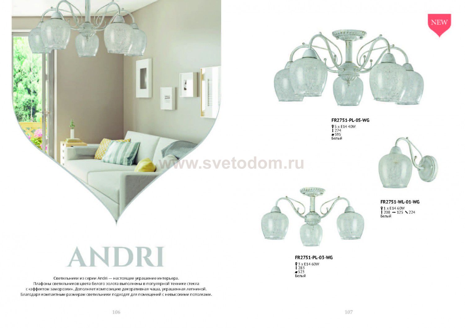 Серия современных светильников. Плафоны светильников Andri цвета белого золота выполнены в популярной технике стекла с эффектом заморозки, а арматура причудливо изогнута. Еще одно украшение светильников – декоративная чашка, украшенная лепниной. Благодаря компактным размерам светильники подходят для помещений с невысокими потолками.