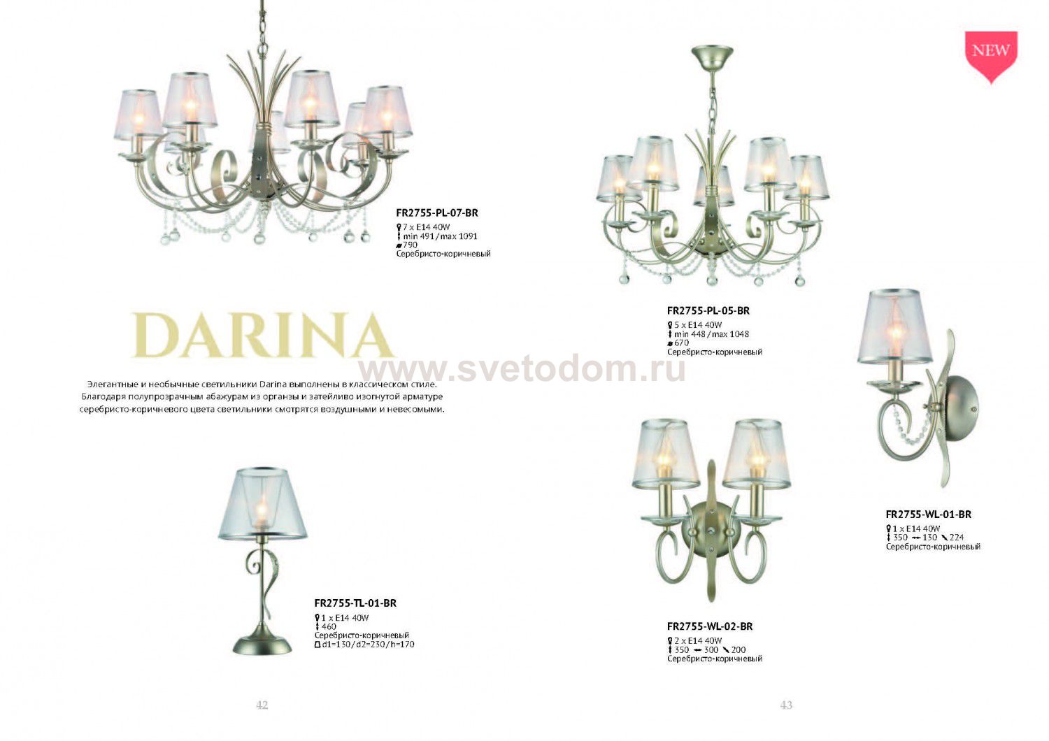 Особенности модели FR2755-PL-07-BR: Элегантные и необычные светильники Darina выполнены в классическом стиле. Благодаря полупрозрачным абажурам из органзы и затейливо изогнутой арматуре серебристокоричневого цвета светильники смотрятся воздушными и невесомыми.