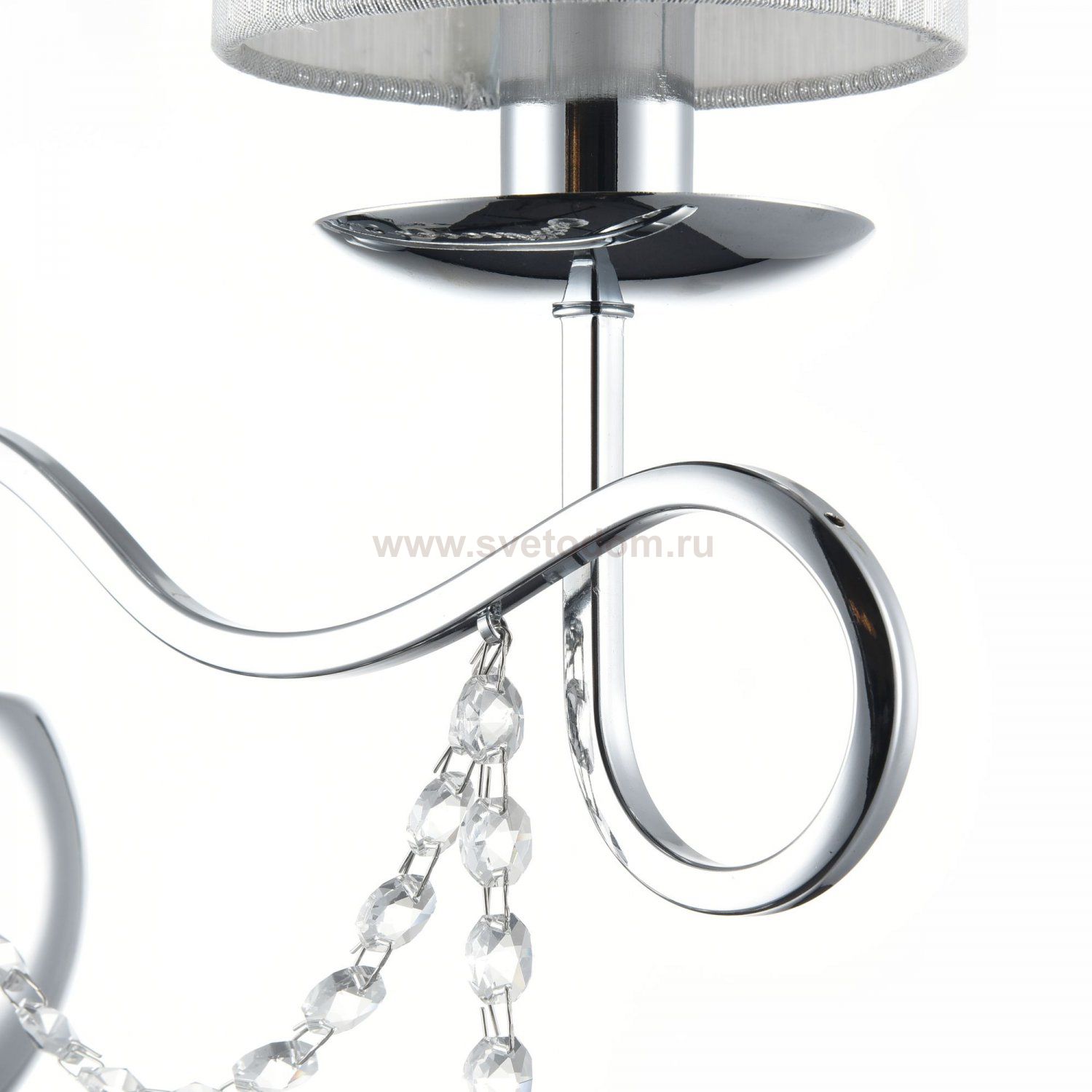 Нарядные и изящные светильники Morel выполнены в классическом стиле. Светлые абажуры сделаны из органзы, арматура – из металла цвета хром". Каждый из светильников этой серии декорирован хрусталем в виде лент из кристаллов в форме октагонов и шара."