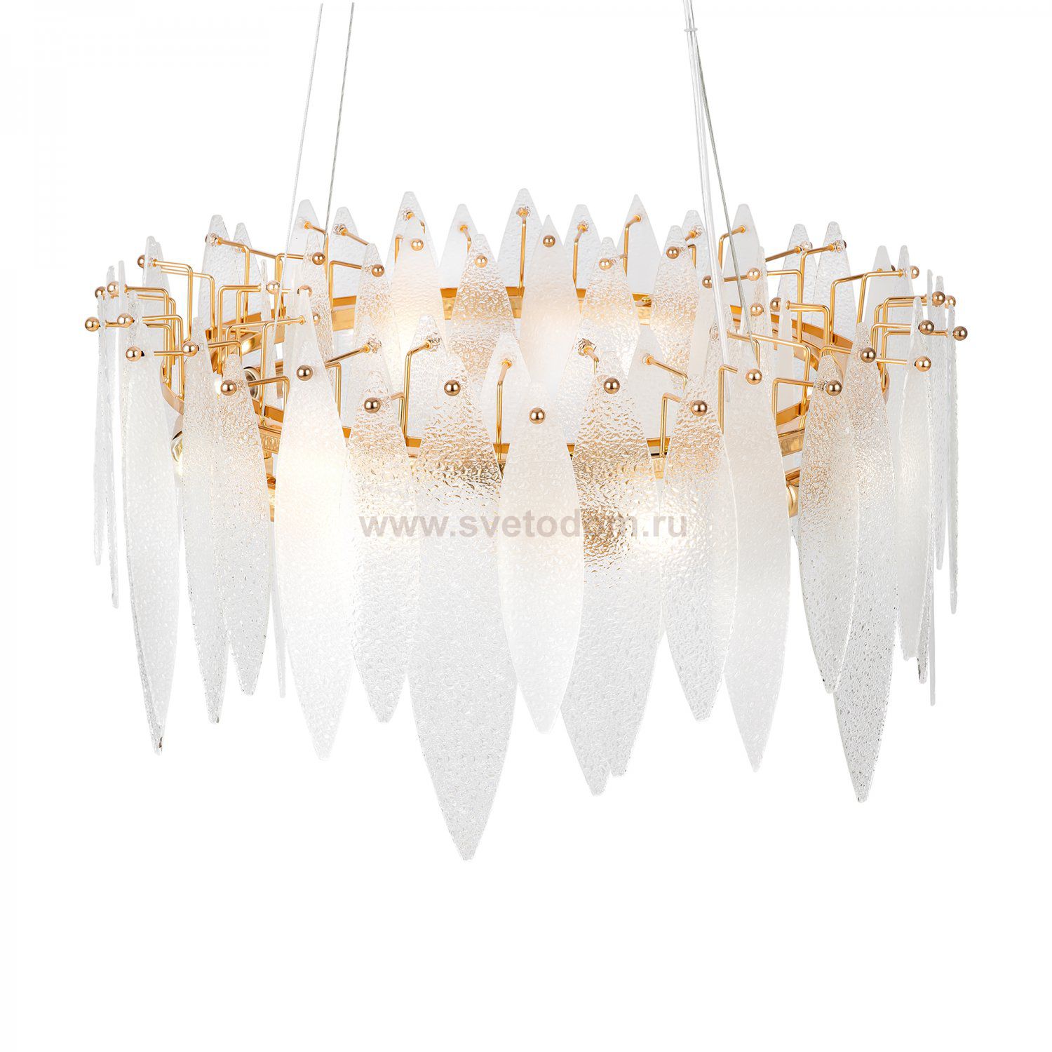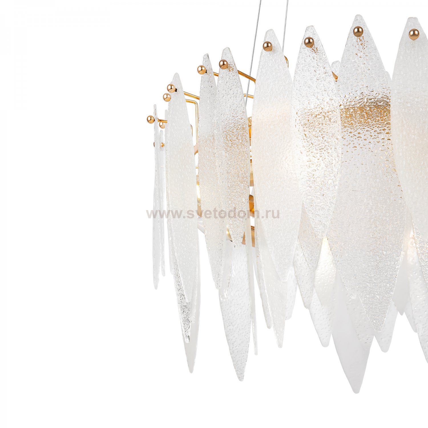 Металлическая арматура, цвет – французское золото. Декоративные элементы выполнены из прозрачного стекла в форме пестрых лепестков ледяной фактуры. Источник света – лампы с цоколем Е14, которые скрыты за декоративными подвесками, размещенными на металлической окружности. Высота подвесов регулируется.