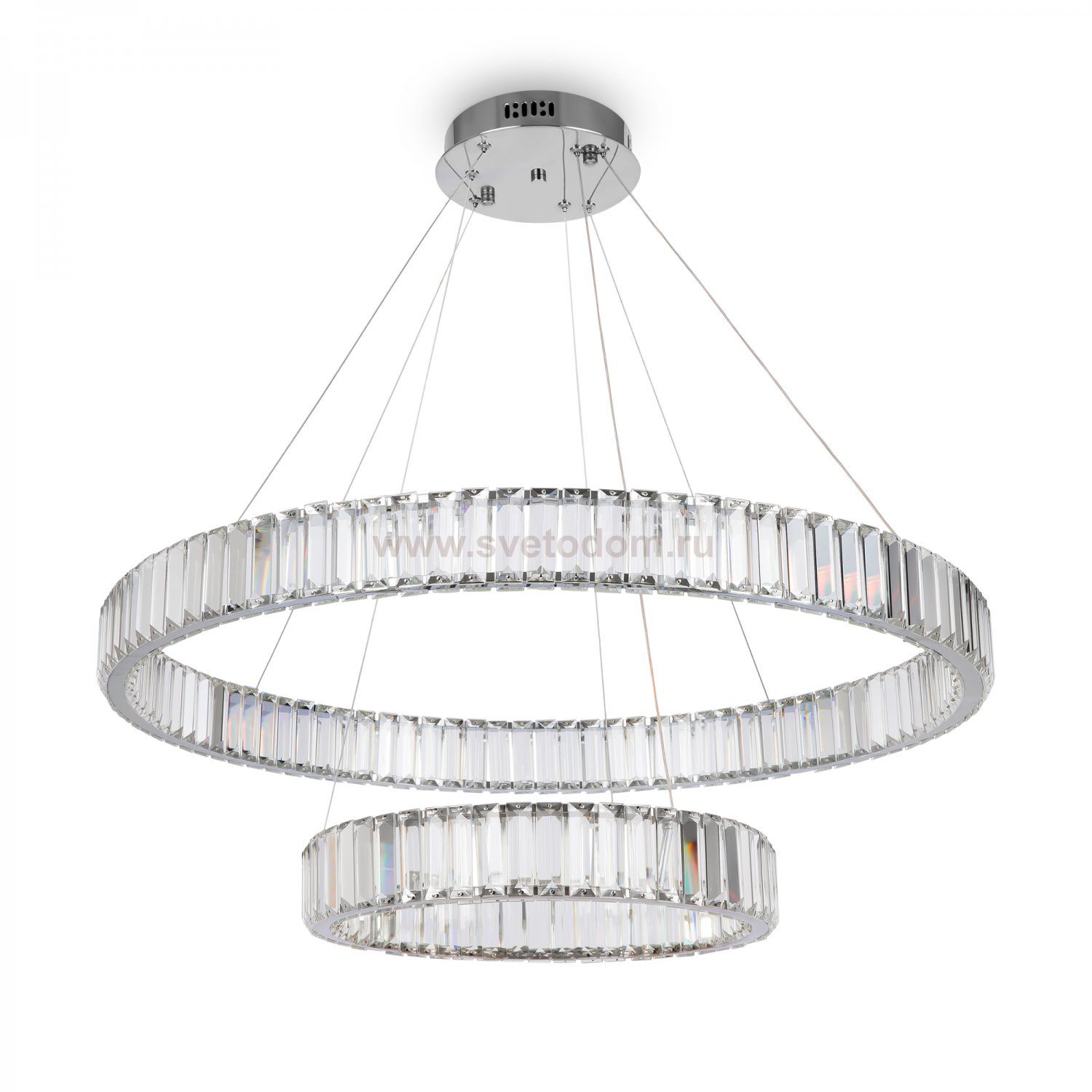 Металлическая арматура в цвете латунь и хром. Хрустальные декоративные кольца с геометричными гранями. LED-источник света. Регулировка цветовой температуры (3000-4000-5000K) и яркости 4G-dimming при помощи пульта (в комплекте).