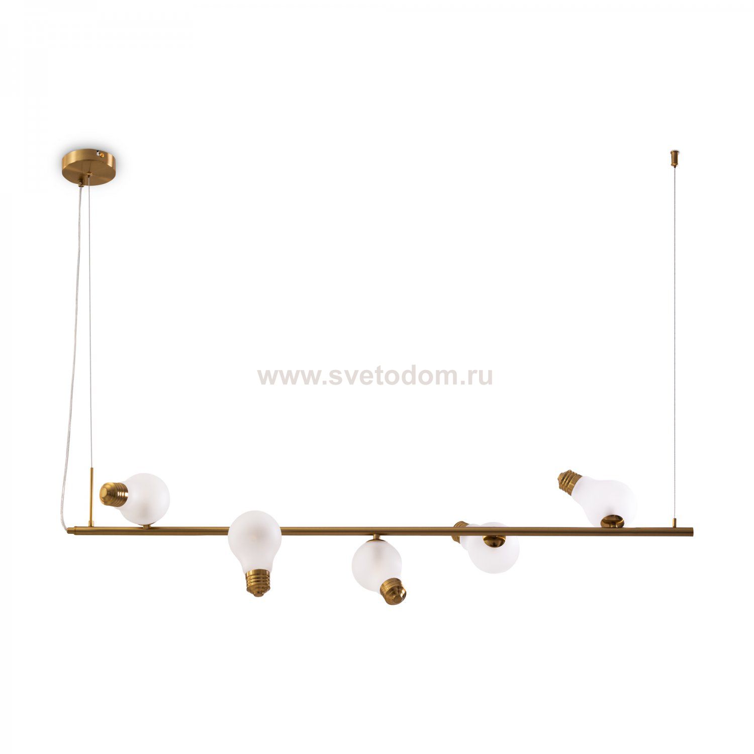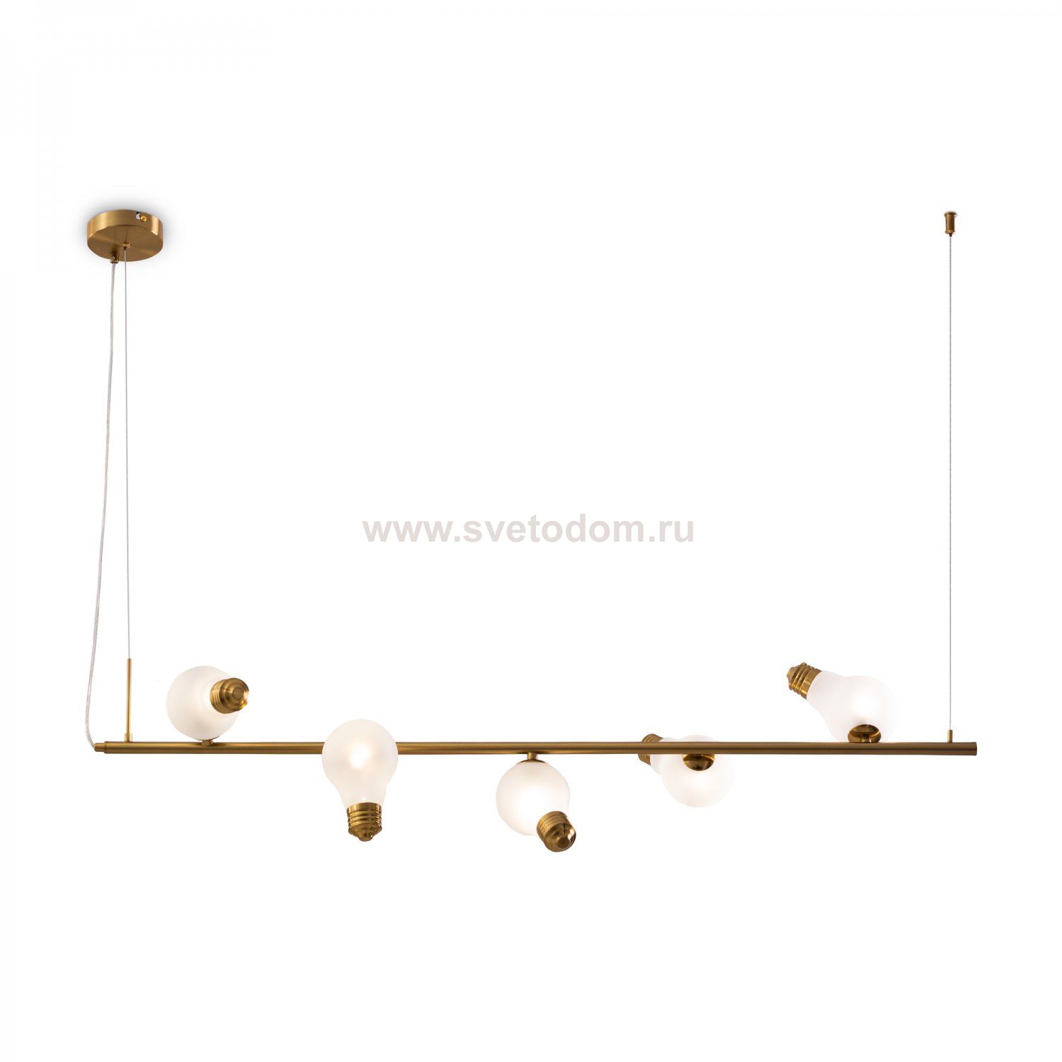 Металлическая арматура, цвета — чёрный и латунь. Прозрачные плафоны-лампочки из стекла в тон арматуры хаотично “разбросаны” по острову светильника. Подвесы регулируются по высоте. Источник света — лампа с цоколем G9.