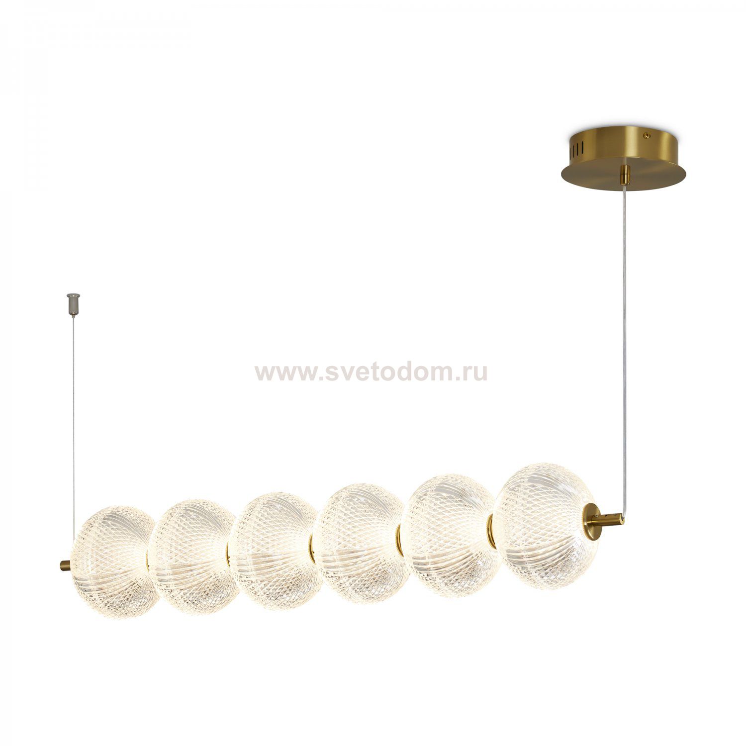 Арматура выполнена из металла в цвете латунь. Прозрачные плафоны. Вертикальные и горизонтальные подвесные светильники разных размеров. LED источник света. Цветовая температура 3000К.