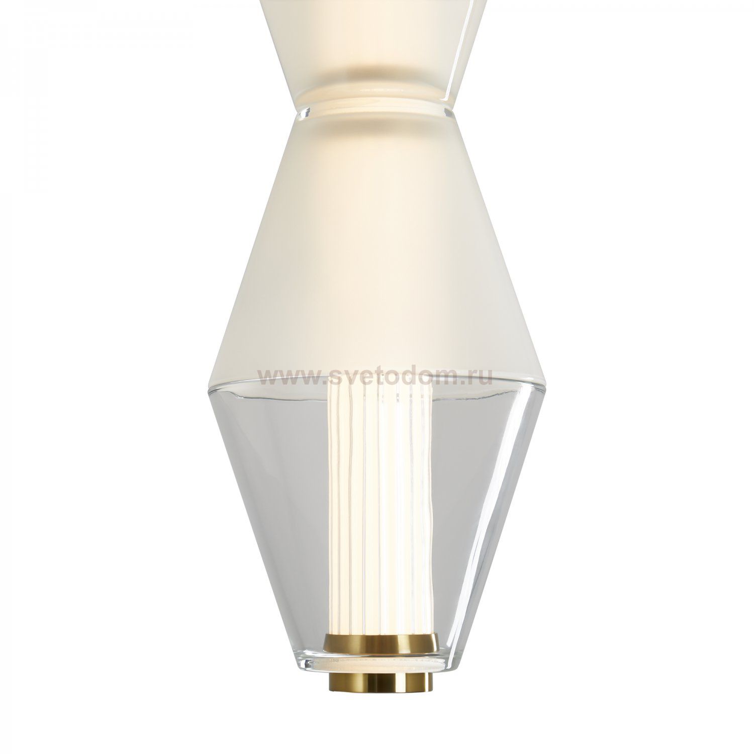 Арматура из металла. Цвет латунь. Плафон из матового, кристально прозрачного и дымчатого стекла. Горизонтальные и вертикальные подвесы. LED источник света. Цветовая температура 3000К.