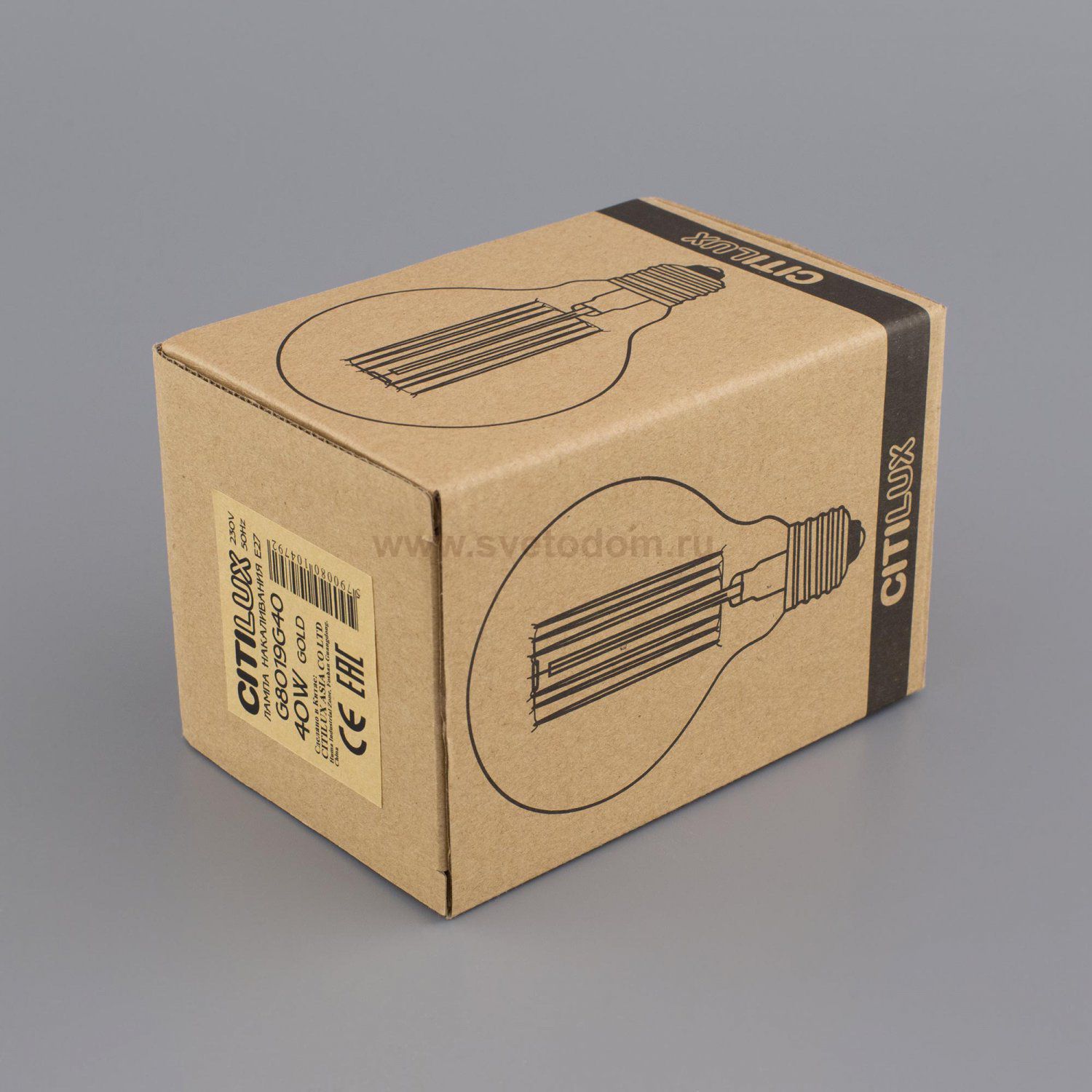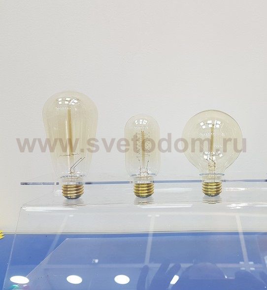 Ретролампа накаливания, Длина 120мм, Диаметр 80мм, нить установлена на 19 поддержках, золотистая колба и латунный цоколь, средний срок службы 3000ч. Комментарий