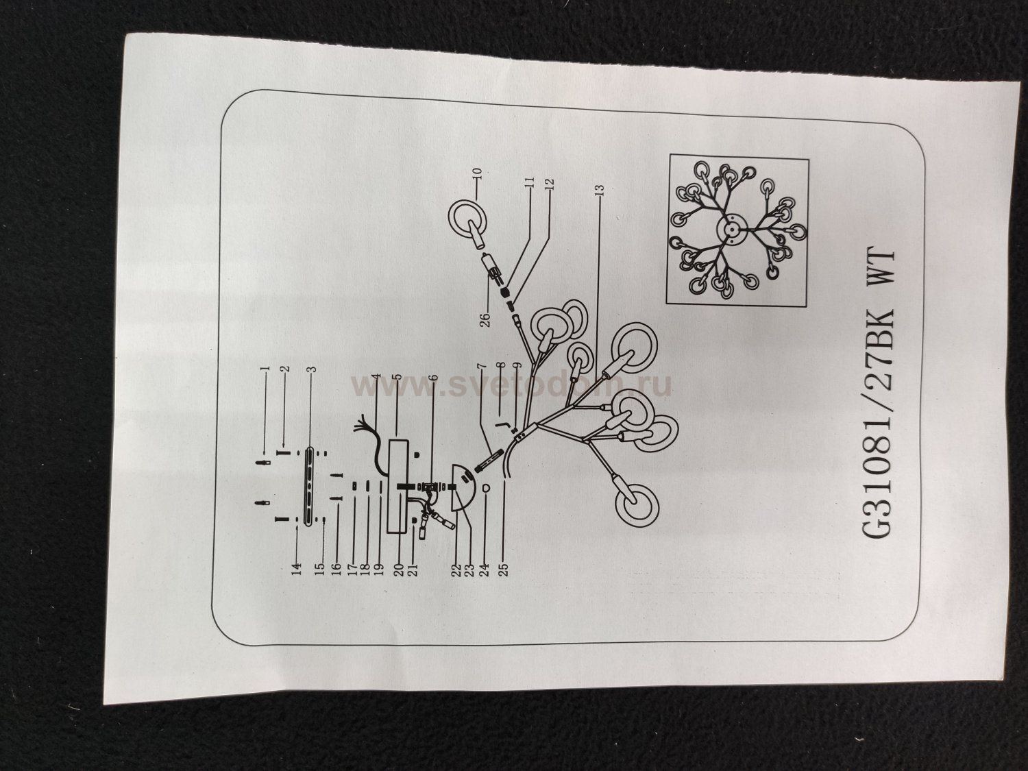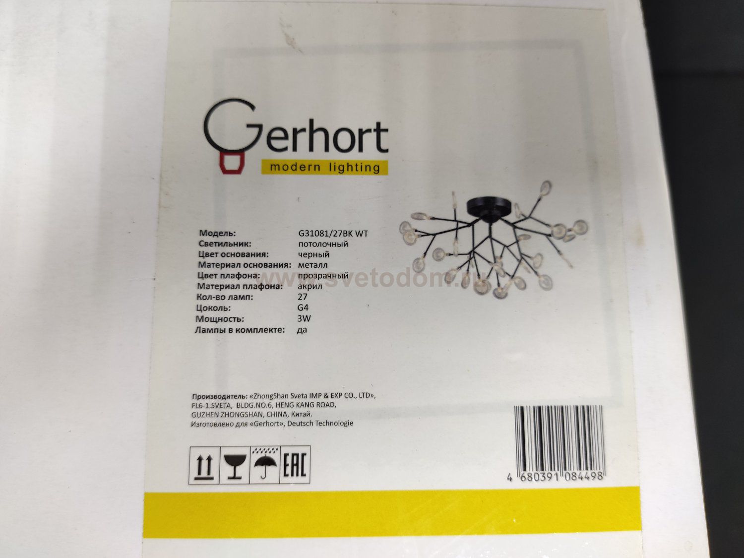 Потолочная люстра G31081/27BK WT от бренда Gerhort. Каркас выполнен из материала металл, цвет черный. Плафоны (светорассеиватели) выполнены из материала акрил, цвет белый полупрозрачный. Цоколь G4 рассчитан на лампы максимальной мощности до 3 Вт, а максимальная площадь освещения составит до 16 м?. Свет теплый, мягкий.