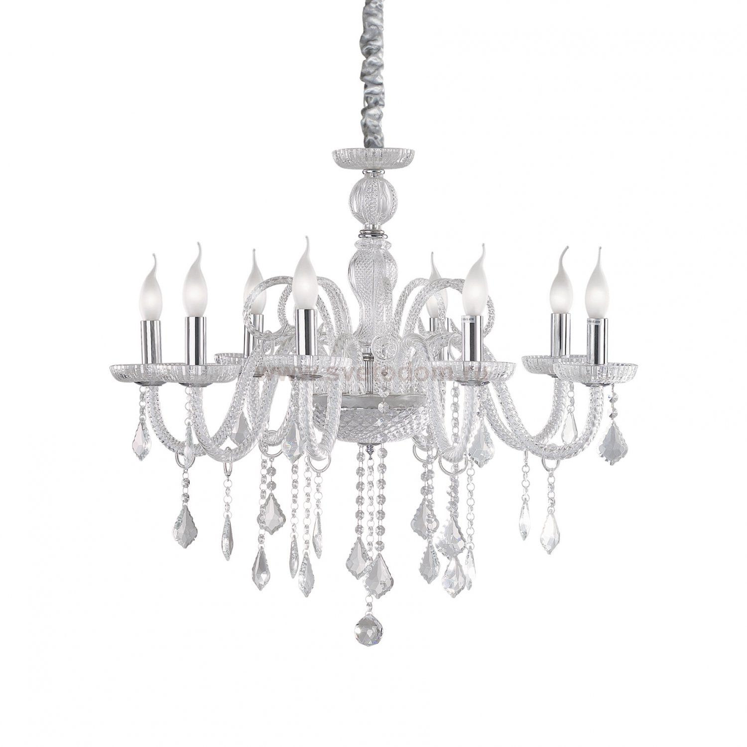 Люстра от известной итальянской фабрики Ideal lux из каталога Classico в венецианском стиле под артикулом GIUDECCA SP8 TRASPARENTE (27838) серии GIUDECCA имеет ряд отличительных характеристик: Люстра из дутого стекла ручной работы с деталями из хромированного металла. Подвески с восьмиугольными хрусталиками и капли из хрусталя с фацетом. Цепь скрыта бархатной цепью.