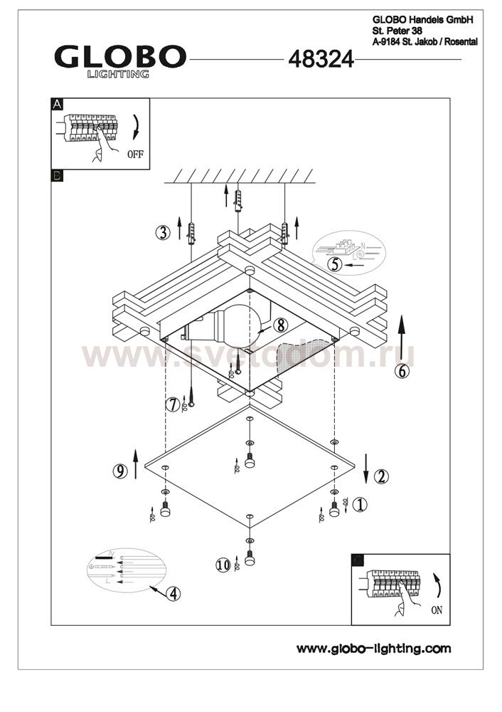 Настенно потолочный светильник Globo (Глобо) 48324 подходит как для установки в вертикальном положении - на стены, так и для установки в горизонтальном - на потолок. Для установки настенно потолочных светильников на натяжной потолок необходимо использовать светодиодные лампы LED, которые экономнее ламп Ильича (накаливания) в 10 раз, выделяют мало тепла и не дадут расплавиться Вашему потолку.