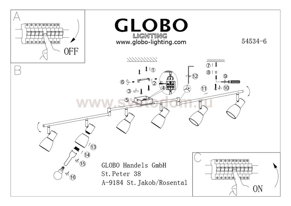 Светильники-споты – это оригинальные изделия с современным дизайном. Они позволяют не ограничивать свою фантазию при выборе освещения для интерьера. Такие модели обеспечивают достаточно качественный свет. Благодаря компактным размерам Вы можете использовать несколько спотов для одного помещения. Интернет-магазин «Светодом» предлагает необычный светильник-спот Globo 54534-6 по привлекательной цене. Эта модель станет отличным дополнением к люстре, выполненной в том же стиле. Перед оформлением заказа изучите характеристики изделия. Купить светильник-спот Globo 54534-6 в нашем онлайн-магазине Вы можете либо с помощью формы на сайте, либо по указанным выше телефонам. Обратите внимание, что у нас склады не только в Москве и Екатеринбурге, но и других городах России.