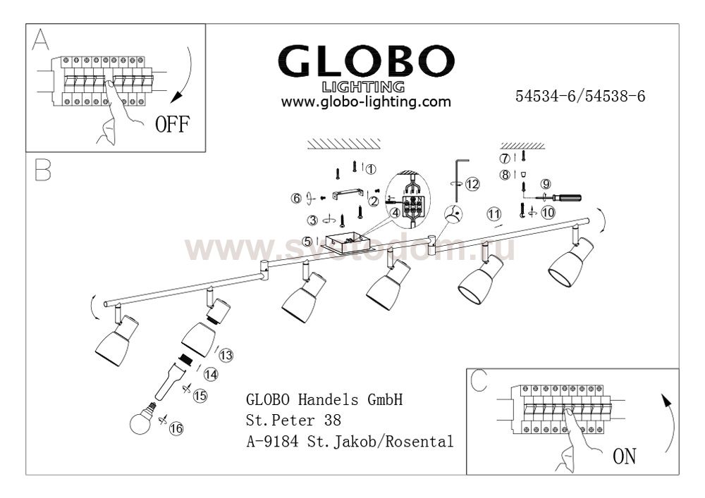 Светильники-споты – это оригинальные изделия с современным дизайном. Они позволяют не ограничивать свою фантазию при выборе освещения для интерьера. Такие модели обеспечивают достаточно качественный свет. Благодаря компактным размерам Вы можете использовать несколько спотов для одного помещения. Интернет-магазин «Светодом» предлагает необычный светильник-спот Globo 54538-6 по привлекательной цене. Эта модель станет отличным дополнением к люстре, выполненной в том же стиле. Перед оформлением заказа изучите характеристики изделия. Купить светильник-спот Globo 54538-6 в нашем онлайн-магазине Вы можете либо с помощью формы на сайте, либо по указанным выше телефонам. Обратите внимание, что у нас склады не только в Москве и Екатеринбурге, но и других городах России.