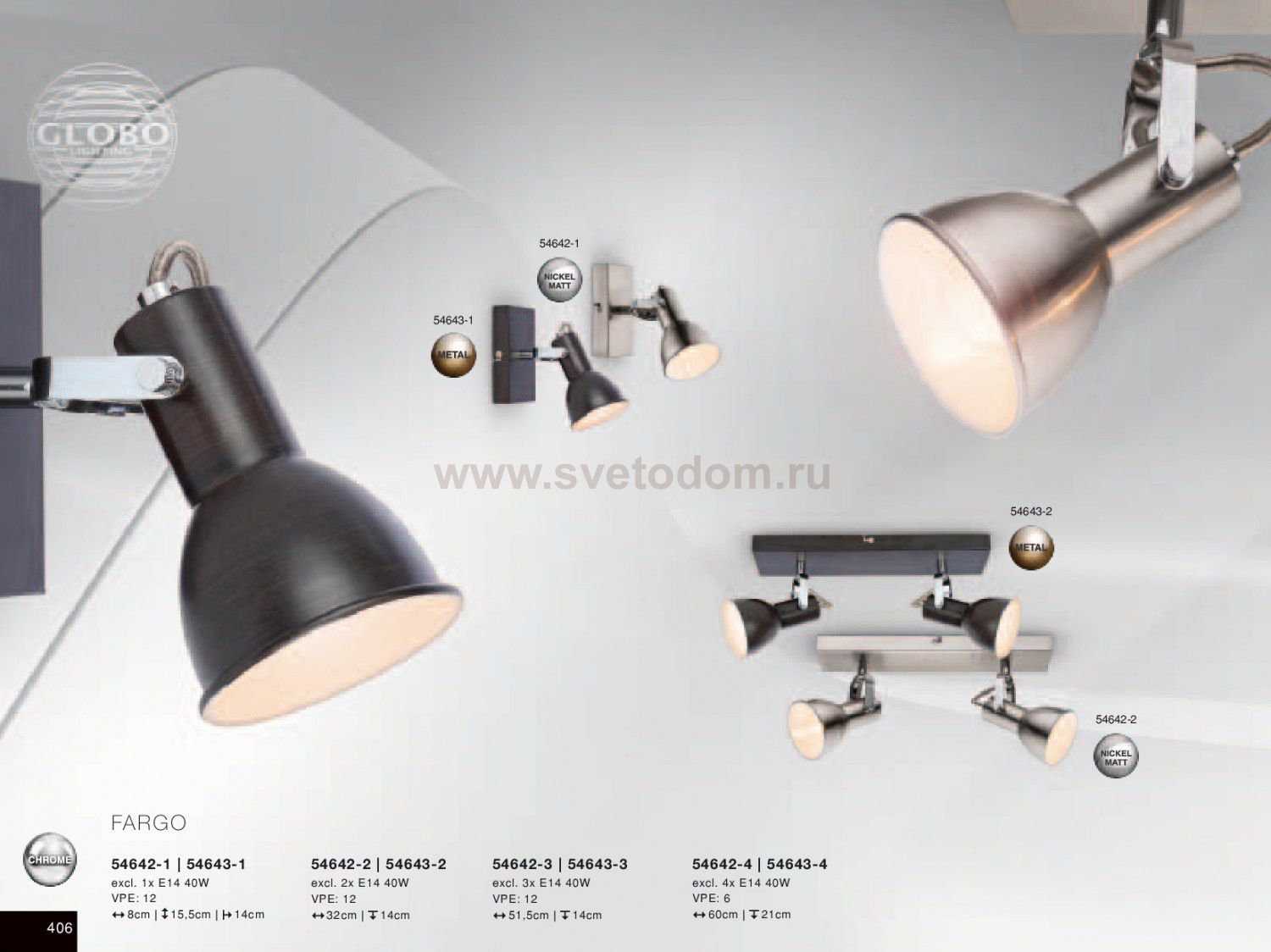 Светильники-споты – это оригинальные изделия с современным дизайном. Они позволяют не ограничивать свою фантазию при выборе освещения для интерьера. Такие модели обеспечивают достаточно качественный свет. Благодаря компактным размерам Вы можете использовать несколько спотов для одного помещения. Интернет-магазин «Светодом» предлагает необычный светильник-спот Globo 54643-2 по привлекательной цене. Эта модель станет отличным дополнением к люстре, выполненной в том же стиле. Перед оформлением заказа изучите характеристики изделия. Купить светильник-спот Globo 54643-2 в нашем онлайн-магазине Вы можете либо с помощью формы на сайте, либо по указанным выше телефонам. Обратите внимание, что у нас склады не только в Москве и Екатеринбурге, но и других городах России.