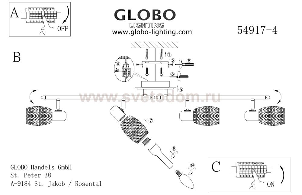 Светильники-споты – это оригинальные изделия с современным дизайном. Они позволяют не ограничивать свою фантазию при выборе освещения для интерьера. Такие модели обеспечивают достаточно качественный свет. Благодаря компактным размерам Вы можете использовать несколько спотов для одного помещения. Интернет-магазин «Светодом» предлагает необычный светильник-спот Globo 54917-4 по привлекательной цене. Эта модель станет отличным дополнением к люстре, выполненной в том же стиле. Перед оформлением заказа изучите характеристики изделия. Купить светильник-спот Globo 54917-4 в нашем онлайн-магазине Вы можете либо с помощью формы на сайте, либо по указанным выше телефонам. Обратите внимание, что у нас склады не только в Москве и Екатеринбурге, но и других городах России.