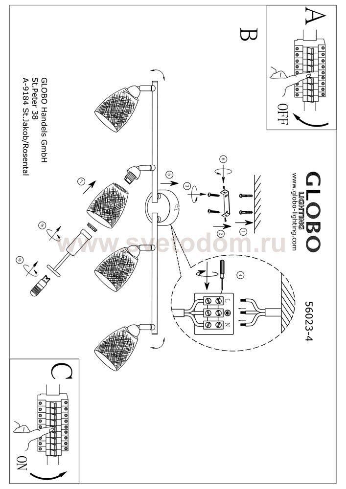Светильники-споты – это оригинальные изделия с современным дизайном. Они позволяют не ограничивать свою фантазию при выборе освещения для интерьера. Такие модели обеспечивают достаточно качественный свет. Благодаря компактным размерам Вы можете использовать несколько спотов для одного помещения. Интернет-магазин «Светодом» предлагает необычный светильник-спот Globo 56023-4 по привлекательной цене. Эта модель станет отличным дополнением к люстре, выполненной в том же стиле. Перед оформлением заказа изучите характеристики изделия. Купить светильник-спот Globo 56023-4 в нашем онлайн-магазине Вы можете либо с помощью формы на сайте, либо по указанным выше телефонам. Обратите внимание, что у нас склады не только в Москве и Екатеринбурге, но и других городах России.