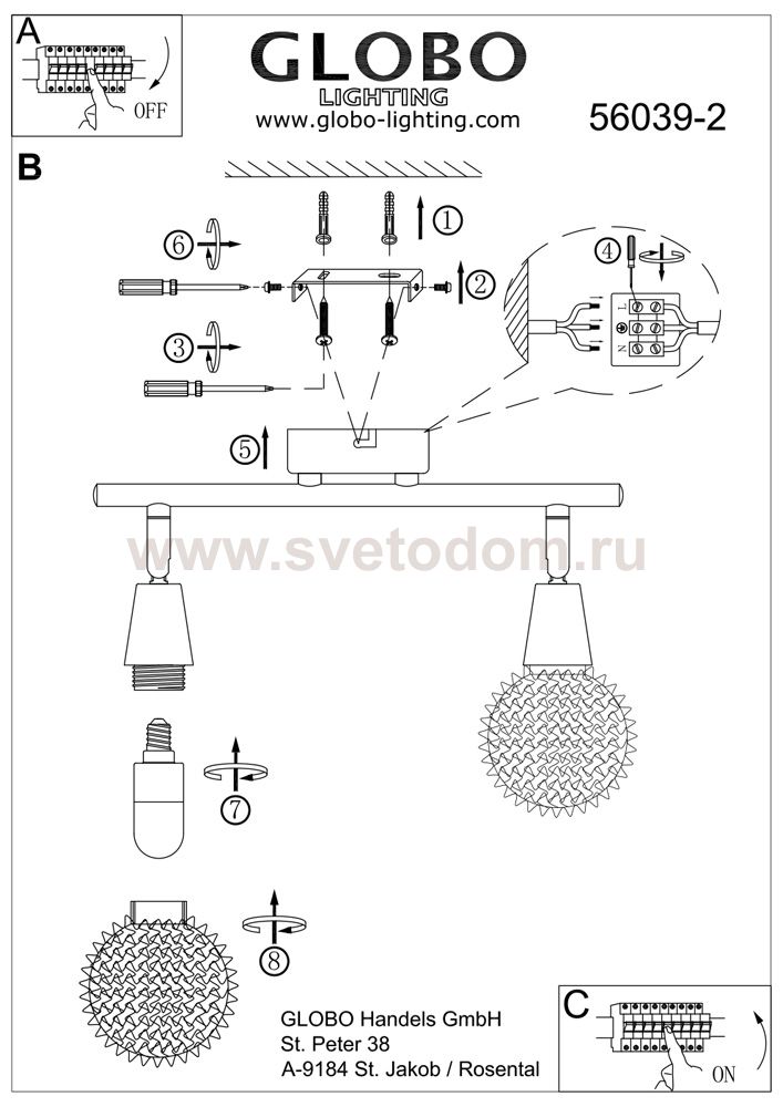 Светильники-споты – это оригинальные изделия с современным дизайном. Они позволяют не ограничивать свою фантазию при выборе освещения для интерьера. Такие модели обеспечивают достаточно качественный свет. Благодаря компактным размерам Вы можете использовать несколько спотов для одного помещения. Интернет-магазин «Светодом» предлагает необычный светильник-спот Globo 56039-2 по привлекательной цене. Эта модель станет отличным дополнением к люстре, выполненной в том же стиле. Перед оформлением заказа изучите характеристики изделия. Купить светильник-спот Globo 56039-2 в нашем онлайн-магазине Вы можете либо с помощью формы на сайте, либо по указанным выше телефонам. Обратите внимание, что у нас склады не только в Москве и Екатеринбурге, но и других городах России.