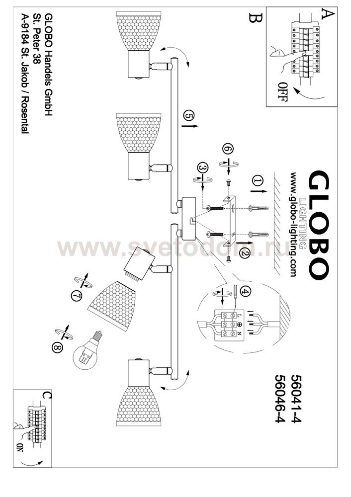 Светильники-споты – это оригинальные изделия с современным дизайном. Они позволяют не ограничивать свою фантазию при выборе освещения для интерьера. Такие модели обеспечивают достаточно качественный свет. Благодаря компактным размерам Вы можете использовать несколько спотов для одного помещения. Интернет-магазин «Светодом» предлагает необычный светильник-спот Globo 56041-4 по привлекательной цене. Эта модель станет отличным дополнением к люстре, выполненной в том же стиле. Перед оформлением заказа изучите характеристики изделия. Купить светильник-спот Globo 56041-4 в нашем онлайн-магазине Вы можете либо с помощью формы на сайте, либо по указанным выше телефонам. Обратите внимание, что у нас склады не только в Москве и Екатеринбурге, но и других городах России.