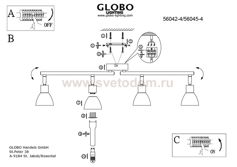 Купить светильник-спот Globo 56042-4 в нашем онлайн-магазине Вы можете либо с помощью формы на сайте, либо по указанным выше телефонам. Обратите внимание, что у нас склады не только в Москве и Екатеринбурге, но и других городах России.