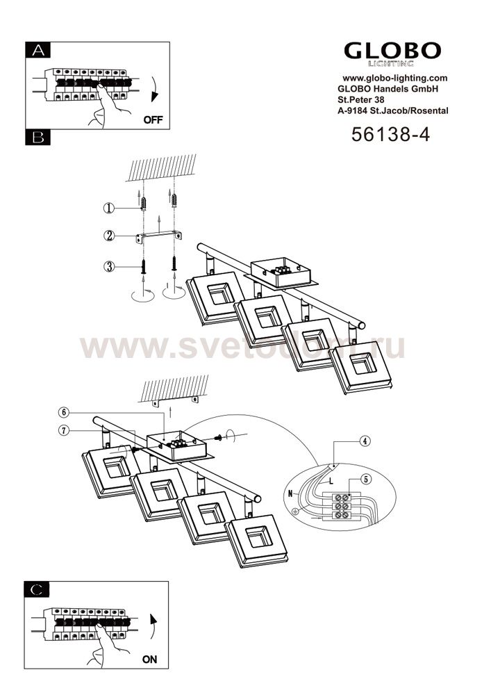 Светильники-споты – это оригинальные изделия с современным дизайном. Они позволяют не ограничивать свою фантазию при выборе освещения для интерьера. Такие модели обеспечивают достаточно качественный свет. Благодаря компактным размерам Вы можете использовать несколько спотов для одного помещения. Интернет-магазин «Светодом» предлагает необычный светильник-спот Globo 56138-4 по привлекательной цене. Эта модель станет отличным дополнением к люстре, выполненной в том же стиле. Перед оформлением заказа изучите характеристики изделия. Купить светильник-спот Globo 56138-4 в нашем онлайн-магазине Вы можете либо с помощью формы на сайте, либо по указанным выше телефонам. Обратите внимание, что у нас склады не только в Москве и Екатеринбурге, но и других городах России.
