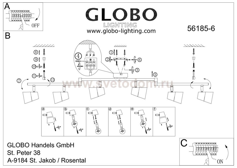 Светильники-споты – это оригинальные изделия с современным дизайном. Они позволяют не ограничивать свою фантазию при выборе освещения для интерьера. Такие модели обеспечивают достаточно качественный свет. Благодаря компактным размерам Вы можете использовать несколько спотов для одного помещения. Интернет-магазин «Светодом» предлагает необычный светильник-спот Globo 56185-6 по привлекательной цене. Эта модель станет отличным дополнением к люстре, выполненной в том же стиле. Перед оформлением заказа изучите характеристики изделия. Купить светильник-спот Globo 56185-6 в нашем онлайн-магазине Вы можете либо с помощью формы на сайте, либо по указанным выше телефонам. Обратите внимание, что у нас склады не только в Москве и Екатеринбурге, но и других городах России.