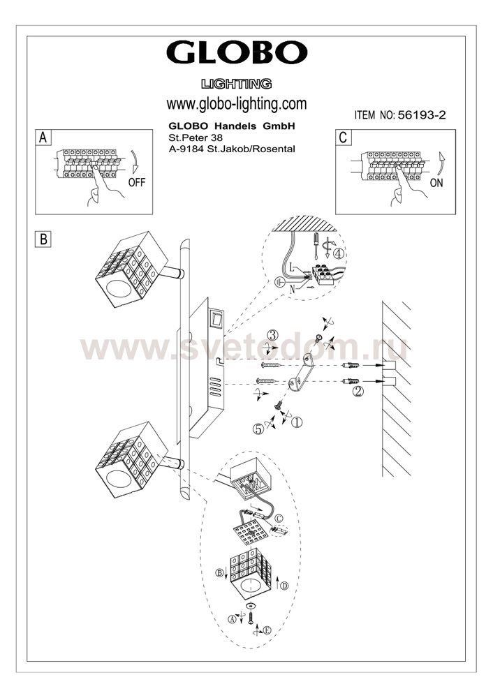 Светильники-споты – это оригинальные изделия с современным дизайном. Они позволяют не ограничивать свою фантазию при выборе освещения для интерьера. Такие модели обеспечивают достаточно качественный свет. Благодаря компактным размерам Вы можете использовать несколько спотов для одного помещения. Интернет-магазин «Светодом» предлагает необычный светильник-спот Globo 56193-2 по привлекательной цене. Эта модель станет отличным дополнением к люстре, выполненной в том же стиле. Перед оформлением заказа изучите характеристики изделия. Купить светильник-спот Globo 56193-2 в нашем онлайн-магазине Вы можете либо с помощью формы на сайте, либо по указанным выше телефонам. Обратите внимание, что у нас склады не только в Москве и Екатеринбурге, но и других городах России.