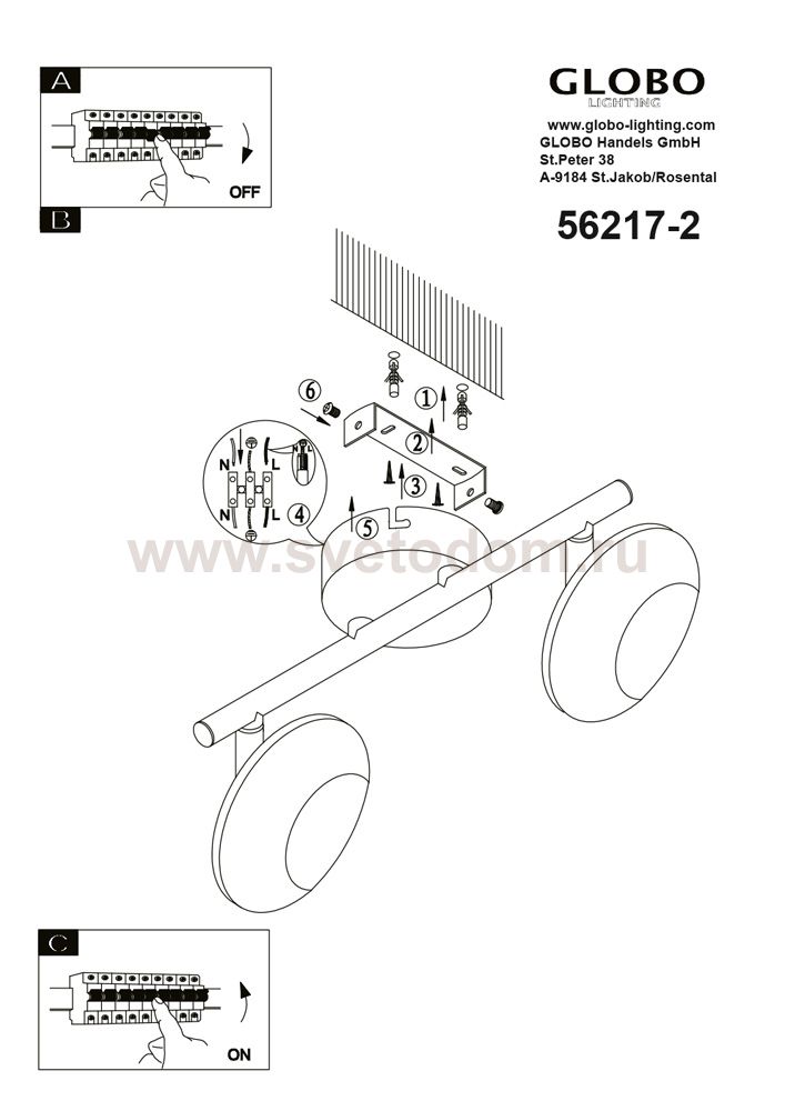 Светильники-споты – это оригинальные изделия с современным дизайном. Они позволяют не ограничивать свою фантазию при выборе освещения для интерьера. Такие модели обеспечивают достаточно качественный свет. Благодаря компактным размерам Вы можете использовать несколько спотов для одного помещения. Интернет-магазин «Светодом» предлагает необычный светильник-спот Globo 56217-2 по привлекательной цене. Эта модель станет отличным дополнением к люстре, выполненной в том же стиле. Перед оформлением заказа изучите характеристики изделия. Купить светильник-спот Globo 56217-2 в нашем онлайн-магазине Вы можете либо с помощью формы на сайте, либо по указанным выше телефонам. Обратите внимание, что у нас склады не только в Москве и Екатеринбурге, но и других городах России.