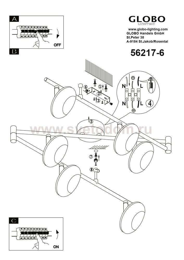 Светильники-споты – это оригинальные изделия с современным дизайном. Они позволяют не ограничивать свою фантазию при выборе освещения для интерьера. Такие модели обеспечивают достаточно качественный свет. Благодаря компактным размерам Вы можете использовать несколько спотов для одного помещения. Интернет-магазин «Светодом» предлагает необычный светильник-спот Globo 56217-6 по привлекательной цене. Эта модель станет отличным дополнением к люстре, выполненной в том же стиле. Перед оформлением заказа изучите характеристики изделия. Купить светильник-спот Globo 56217-6 в нашем онлайн-магазине Вы можете либо с помощью формы на сайте, либо по указанным выше телефонам. Обратите внимание, что у нас склады не только в Москве и Екатеринбурге, но и других городах России.