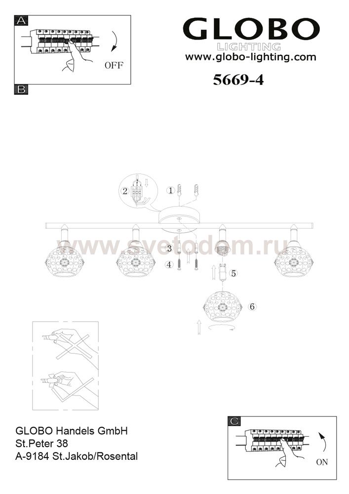 Светильники-споты – это оригинальные изделия с современным дизайном. Они позволяют не ограничивать свою фантазию при выборе освещения для интерьера. Такие модели обеспечивают достаточно качественный свет. Благодаря компактным размерам Вы можете использовать несколько спотов для одного помещения. Интернет-магазин «Светодом» предлагает необычный светильник-спот Globo 5669-4 по привлекательной цене. Эта модель станет отличным дополнением к люстре, выполненной в том же стиле. Перед оформлением заказа изучите характеристики изделия. Купить светильник-спот Globo 5669-4 в нашем онлайн-магазине Вы можете либо с помощью формы на сайте, либо по указанным выше телефонам. Обратите внимание, что у нас склады не только в Москве и Екатеринбурге, но и других городах России.